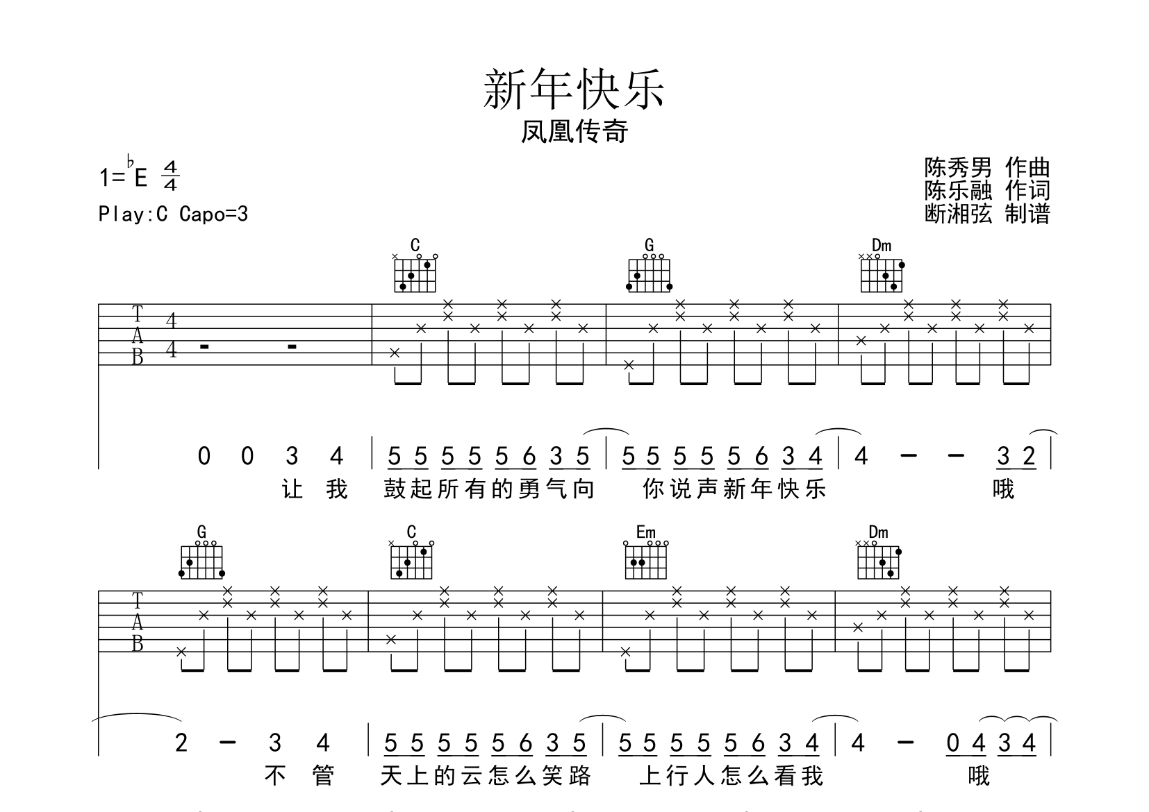曲谱介绍: 由@断湘弦制谱的《新年快乐》吉他谱,共有3张高清图片谱例,本谱为C调编配吉他谱,变调夹夹3品弹唱原调bE,节奏4/4拍,难度较简单。