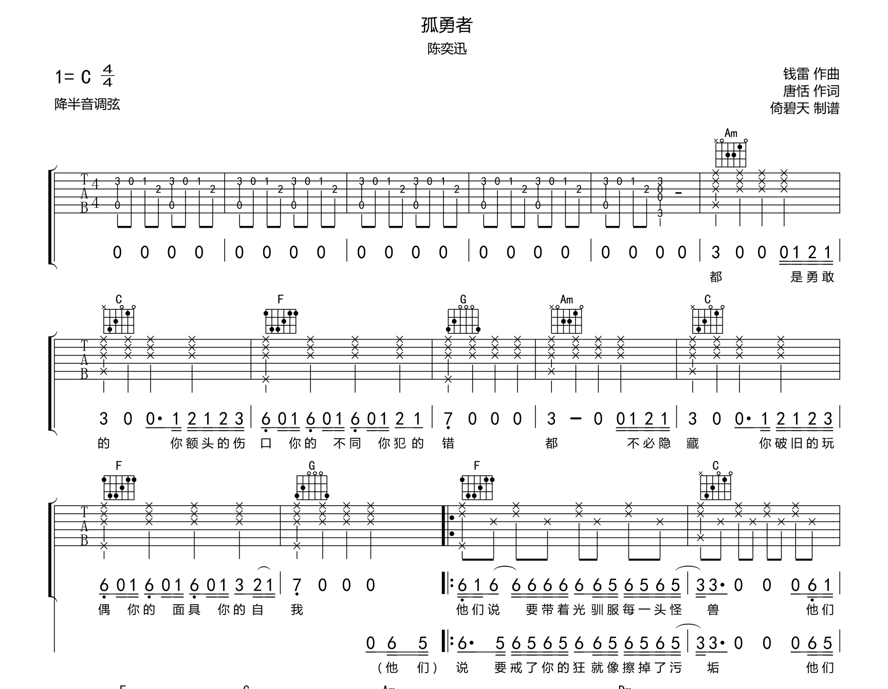 曲谱介绍: 由创作者倚碧天制谱的《孤勇者》吉他谱【女生版附音频】,共有3张高清图片谱例,本谱C调指法编配,唱原调需降半音调弦,女生演唱建议变调夹3品,男低音建议如音频所示变调夹5品,节奏4/4拍,难度较简单。 吉他弹唱预览音频: