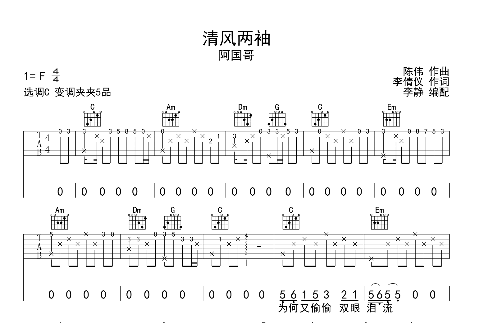 曲谱介绍: 阿国哥《清风两袖》吉他谱,由@李静制谱,《清风两袖》吉他弹唱谱,共有两张图片谱,本谱采用C调和弦编配,节奏4/4拍,曲速80拍每分钟,弹唱建议变调夹夹5品,指法简单。
