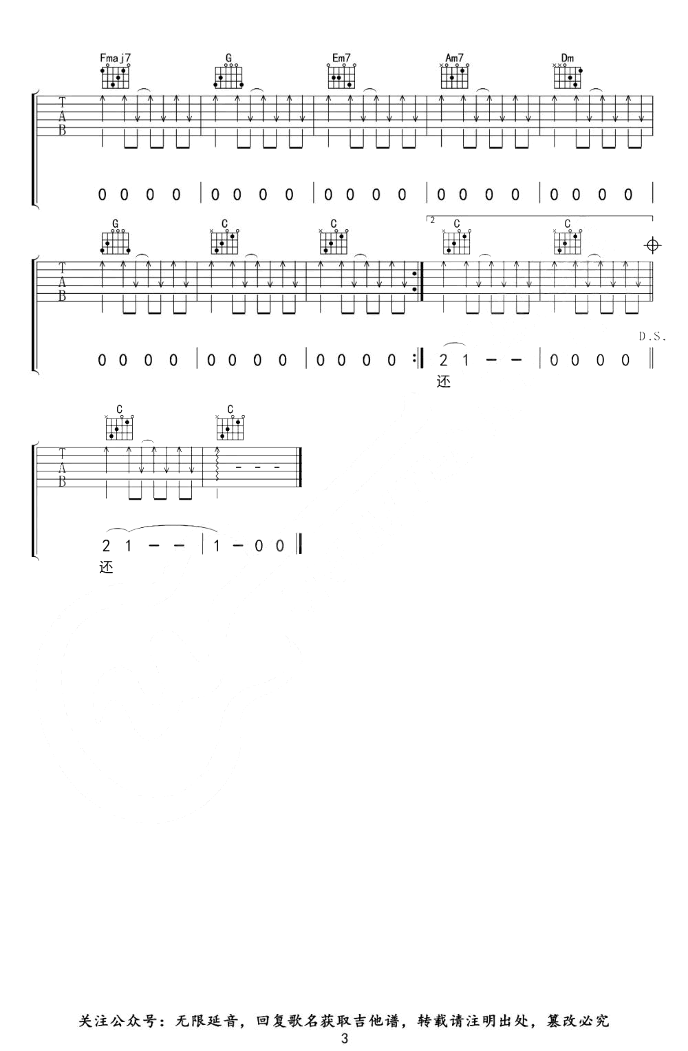 曲谱介绍: 《宿敌》吉他弹唱谱,原调升F,变调夹夹六品,选用C调指法编配,六线谱共三张图片。