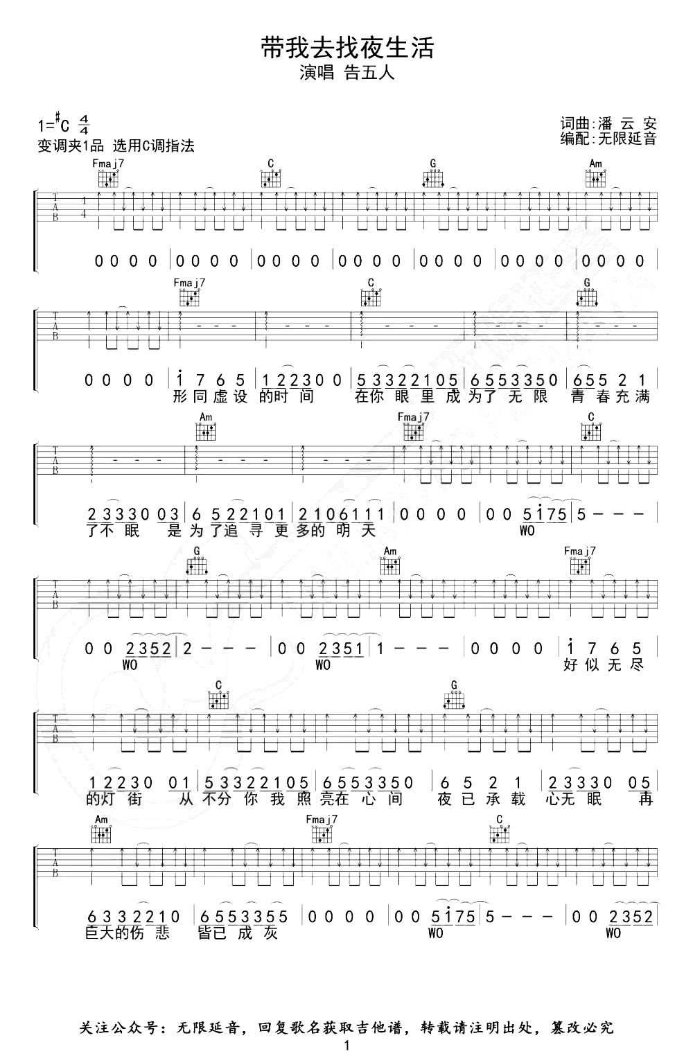 曲谱介绍: 《带我去找夜生活》吉他弹唱谱,原调升C,变调夹夹一品,选用C调指法,三张图片六线谱。