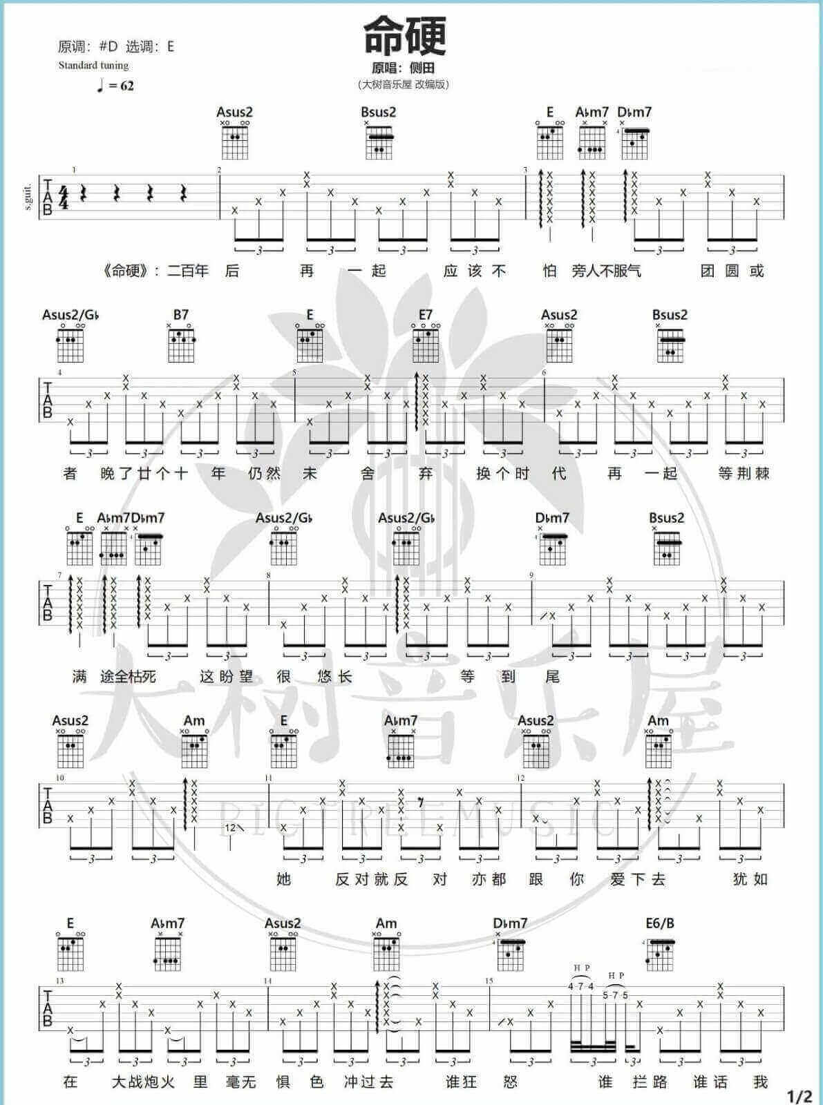 曲谱介绍: 侧田《命硬》吉他弹唱谱,采用E调指法编配,共有2张高清图谱,免翻页排版设计。