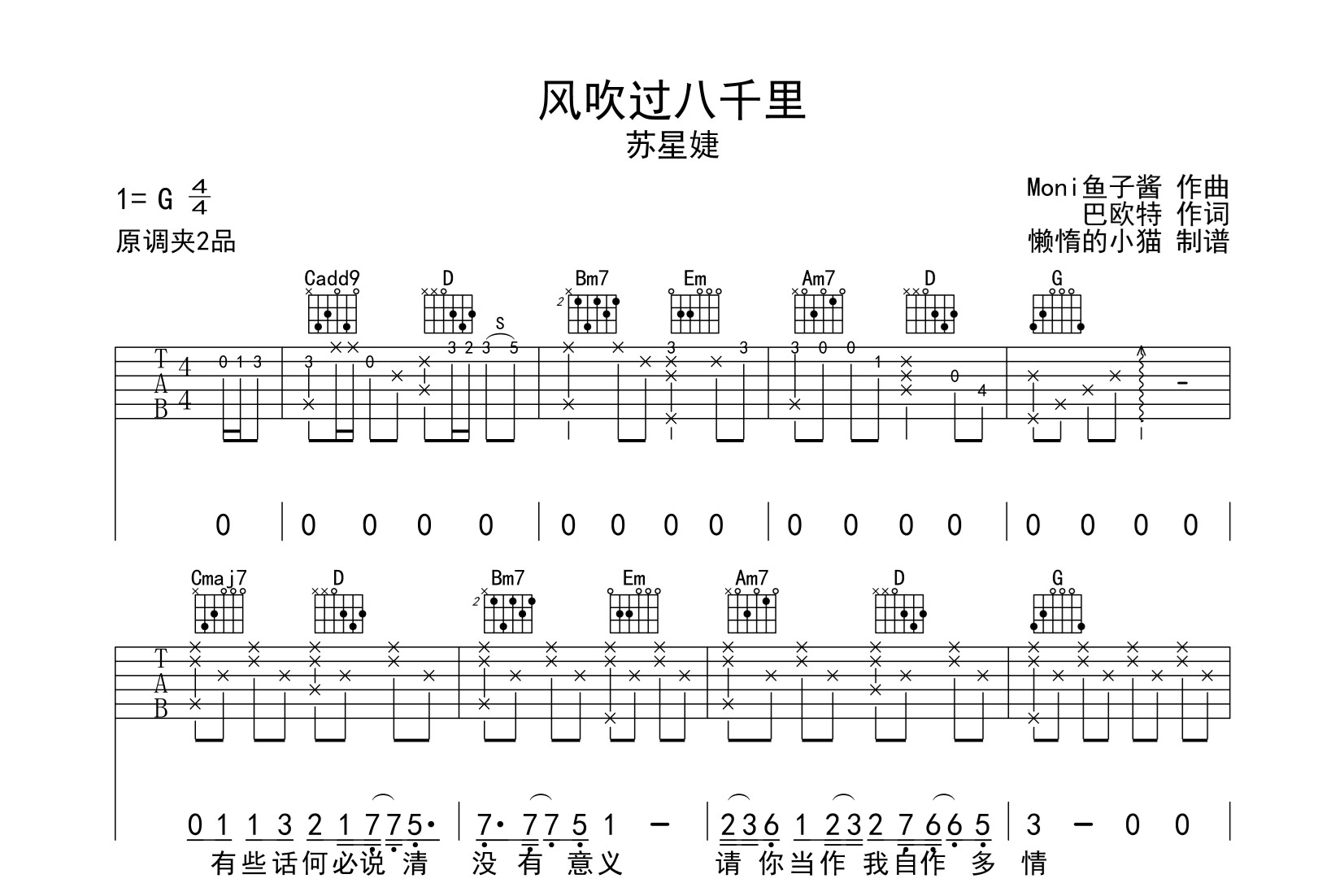 曲谱介绍: 《风吹过八千里》 这首曲谱总共3张高清图片谱,原调为D调,使用C调指法,变调夹推荐夹2品弹唱。