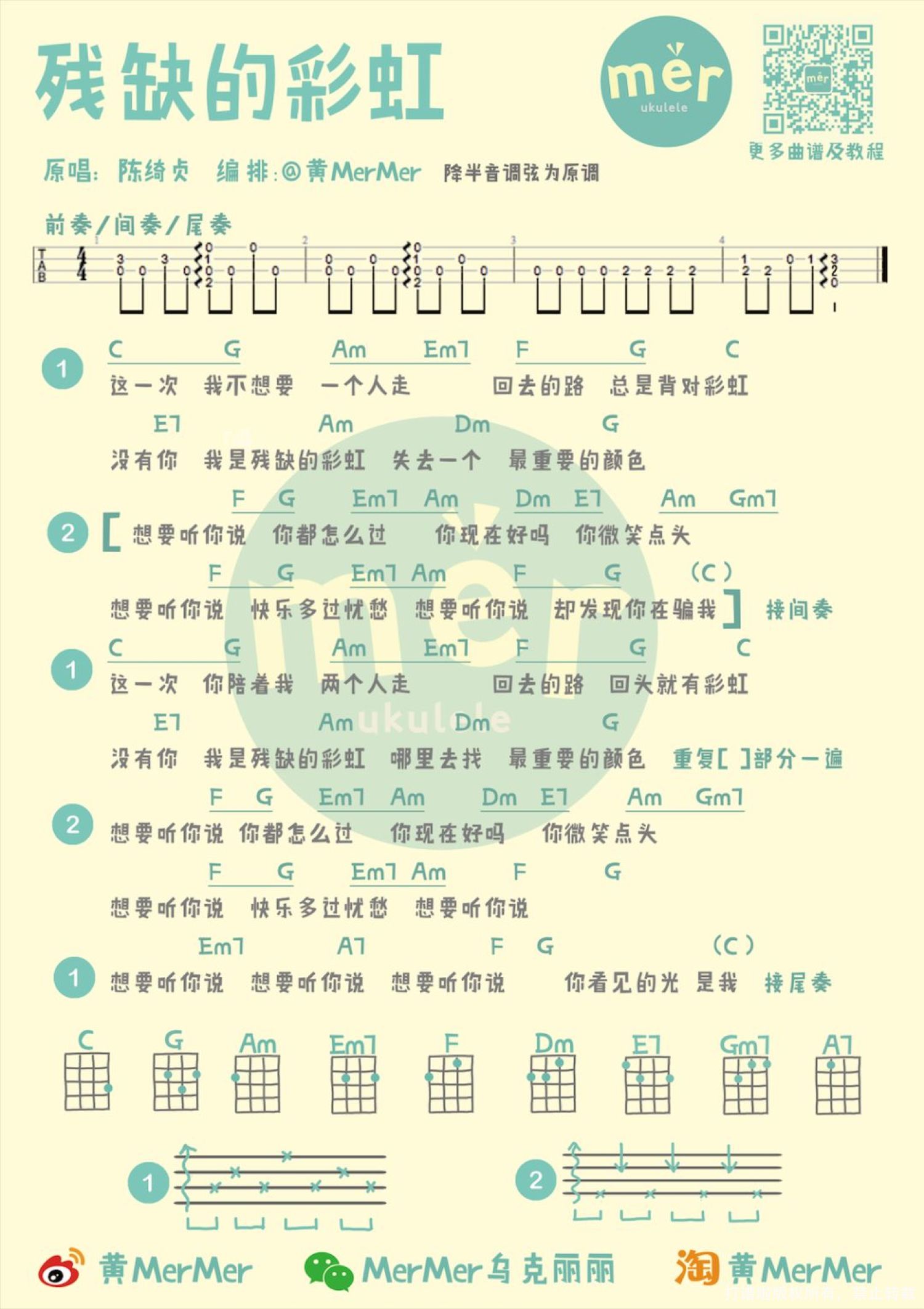 曲谱介绍: MerMer说 陈老师上周出新歌啦~依然很“陈绮贞”的一首。她说:“我们的生活中有很多无法弥补的小小的遗憾 或是大大的感伤 但是不要忘记了 就像彩虹一样 即使残缺 彩虹仍旧是彩虹 只要活着 我们的生命就是一个奇迹 希望你们会喜欢这首歌。” 每个人,都要努力成为自己的彩虹呀。   弹唱   教学   曲谱