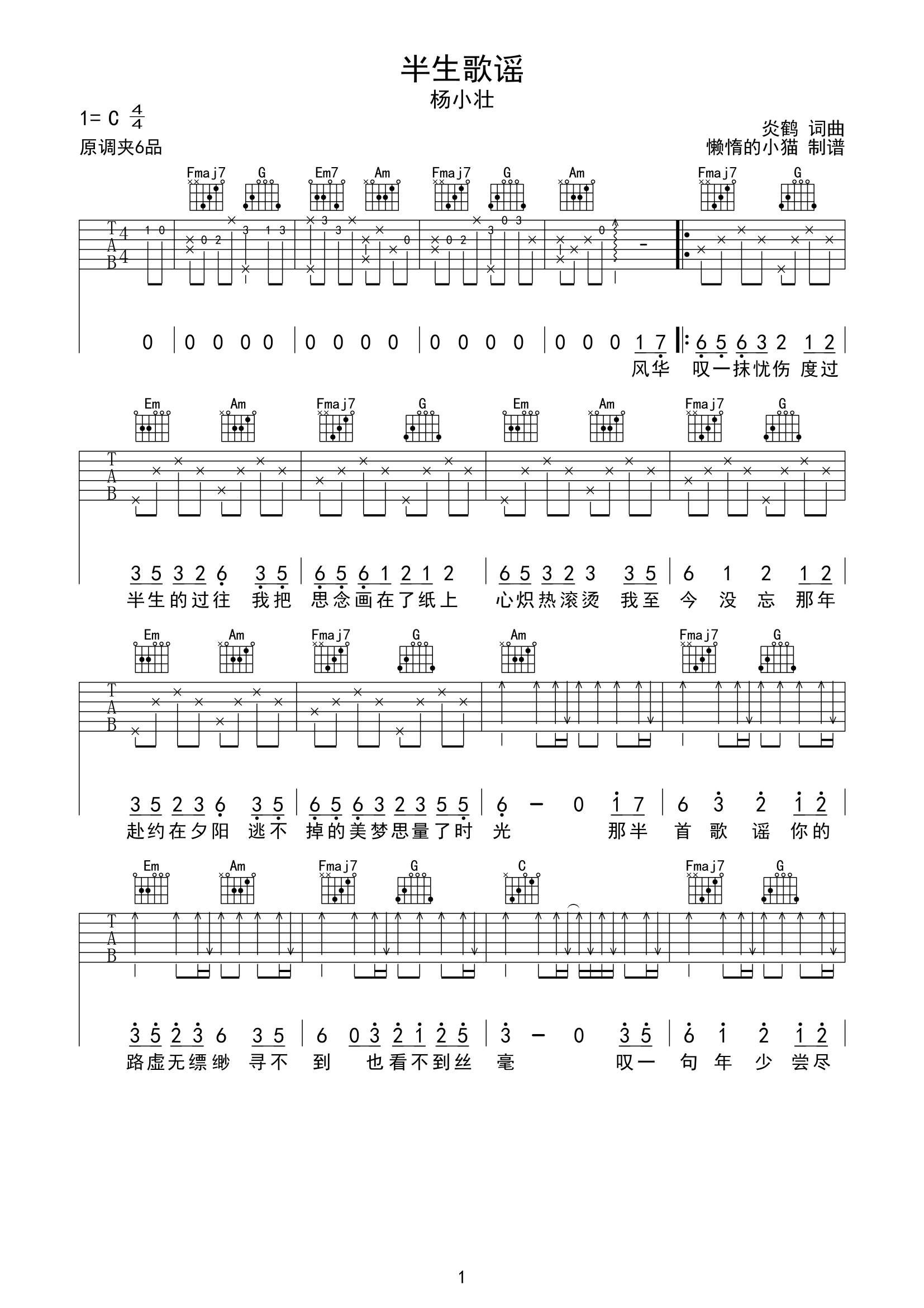 曲谱介绍: 《半生歌谣》总共3张高清图片谱,原调为升F调,使用C调指法编配,建议大家弹唱时,变调夹夹6品弹唱原调。