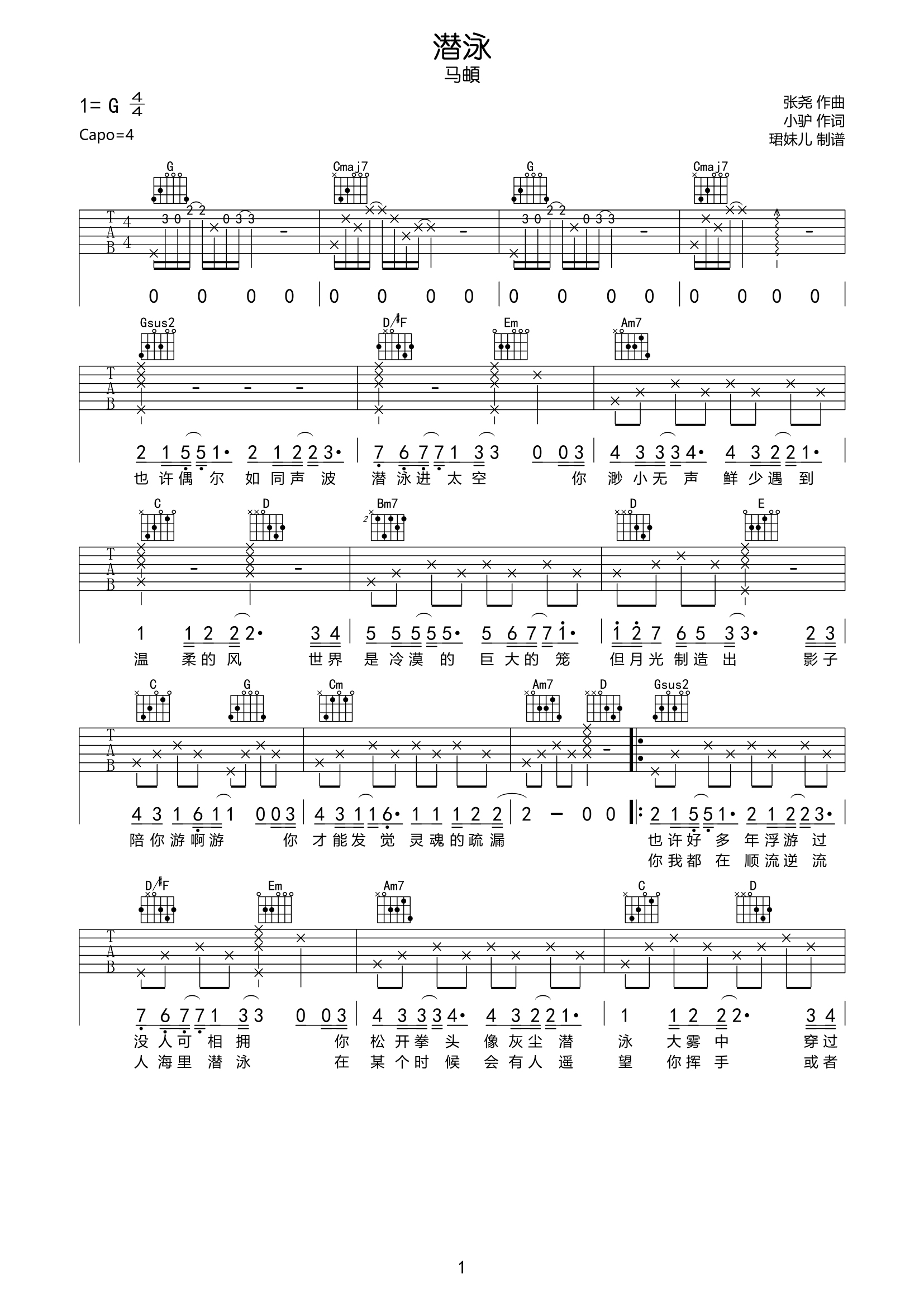 曲谱介绍: 《潜泳》这首曲谱总共3张高清图片谱,本谱采用G调指法编配,弹唱建议变调夹4品。难度较简单。