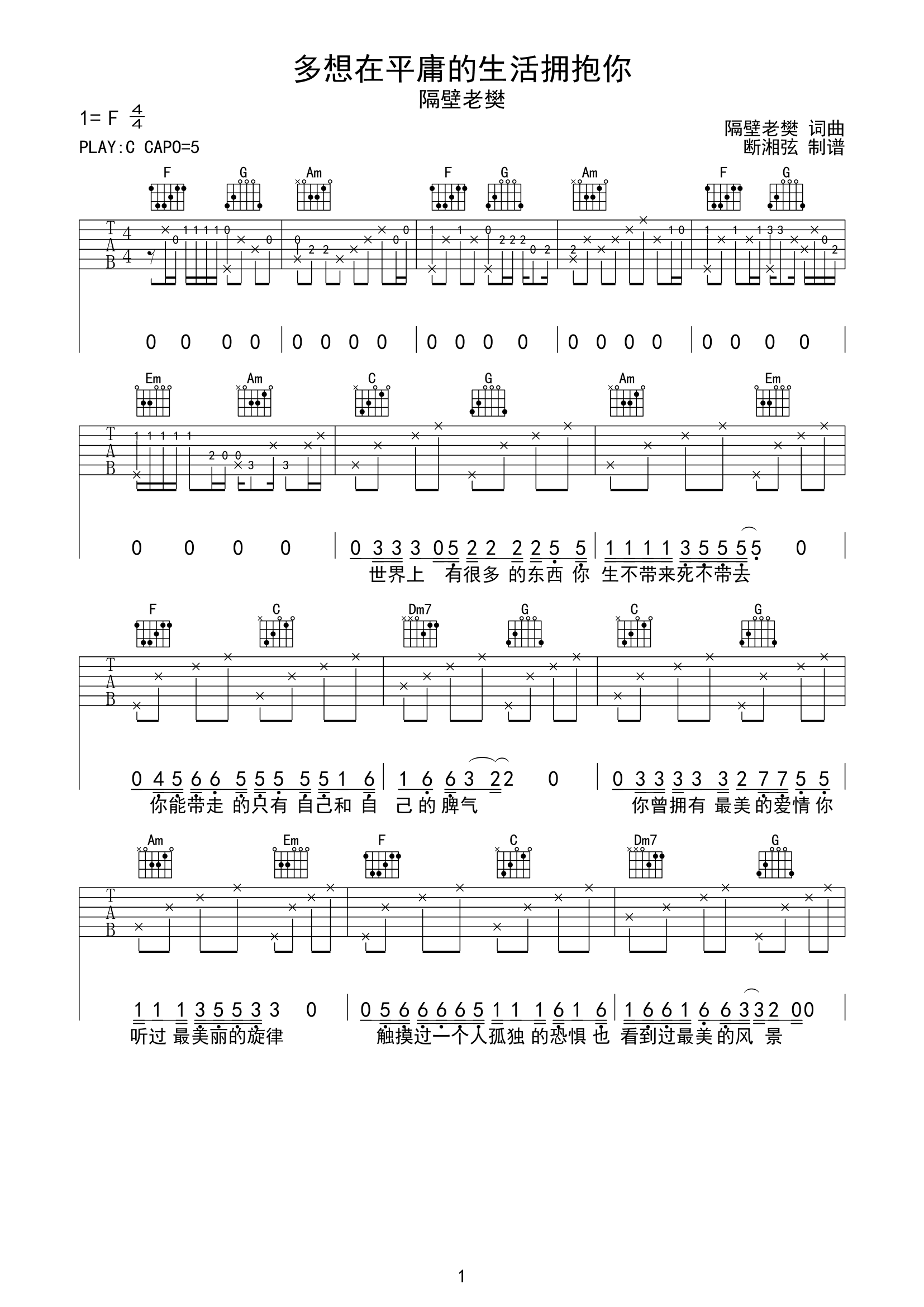 曲谱介绍: 《多想在平庸的生活拥抱你》这首曲谱总共3张高清图片谱,由断湘弦制谱,原调F调,本谱为C调编配,变调夹推荐夹5品。