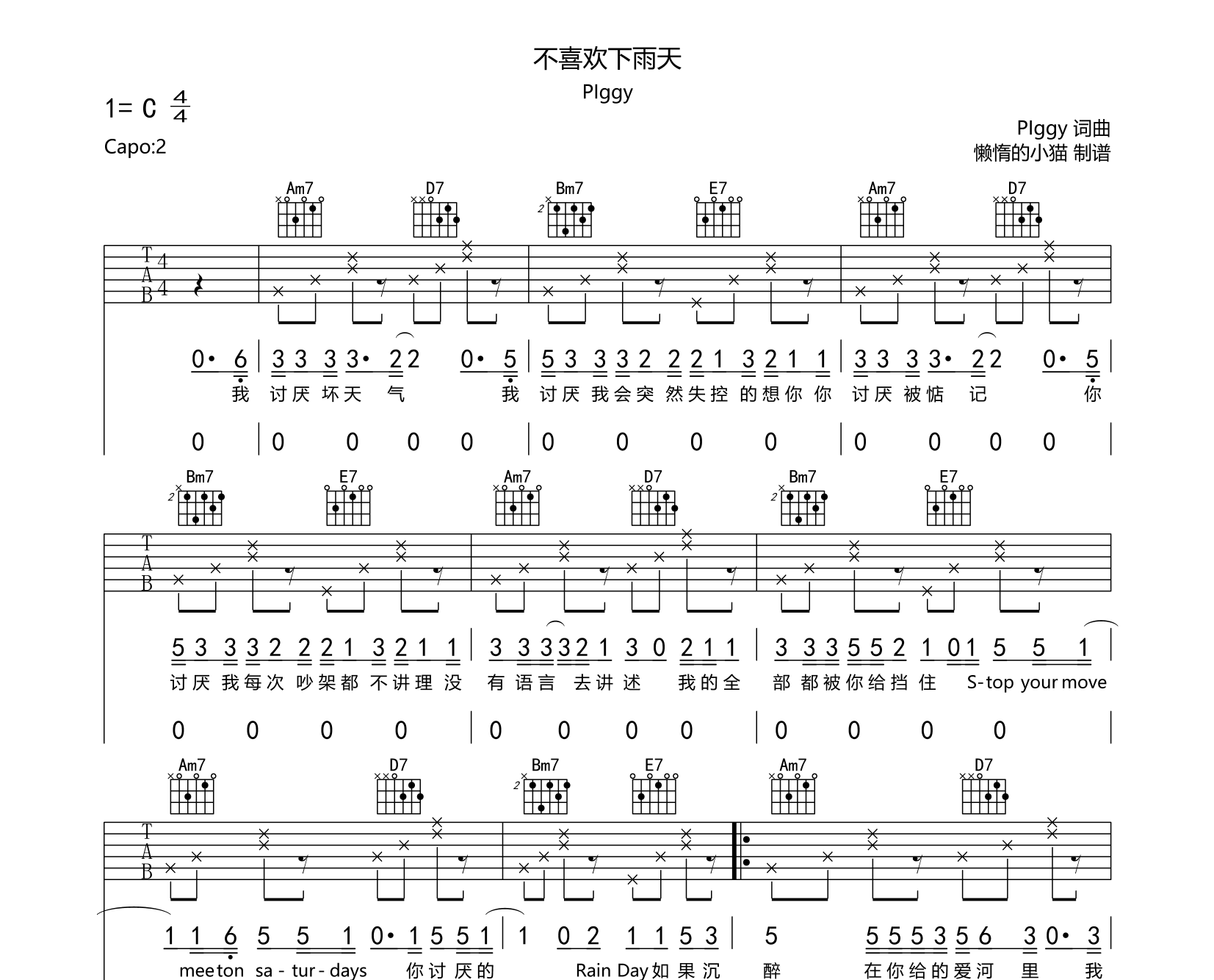 不喜欢下雨天吉他谱 - plggy - C调吉他弹唱谱 - 原版