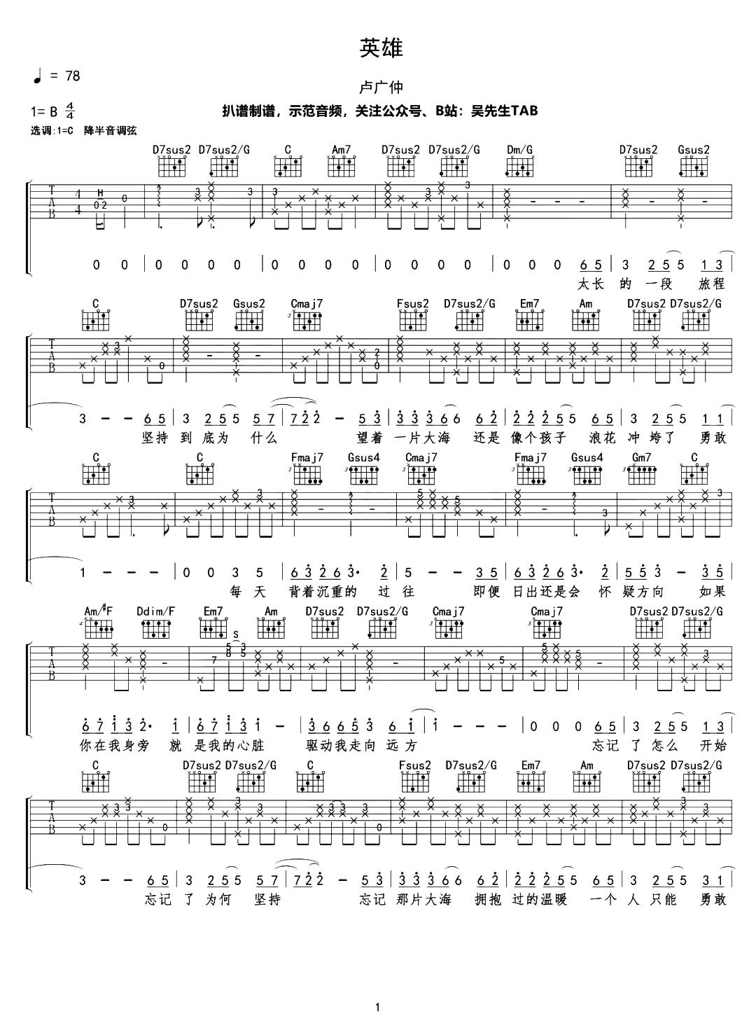 曲谱介绍: 《英雄》这首曲谱由吴先生制谱,总共2张高清图片谱,原调B调,选用C调指法编配,降半音调弦。弹唱难度适中,需要注意细节。