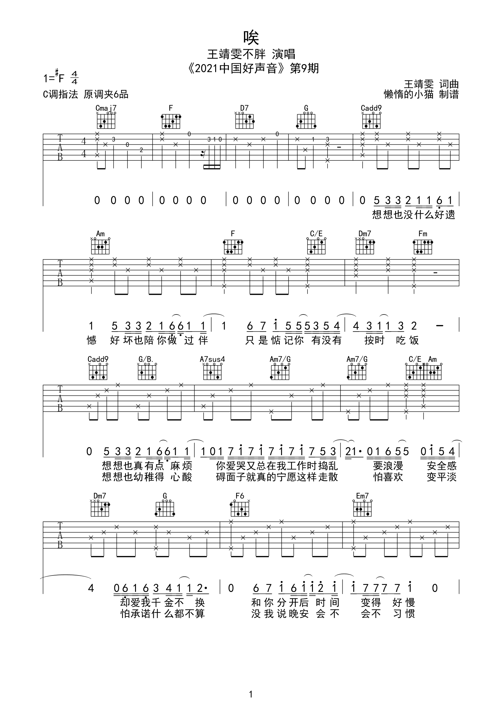 曲谱介绍: 《唉》吉他弹唱谱,总共3张高清图片谱,原调为升F调,使用C调指法,建议变调夹夹6品弹唱。