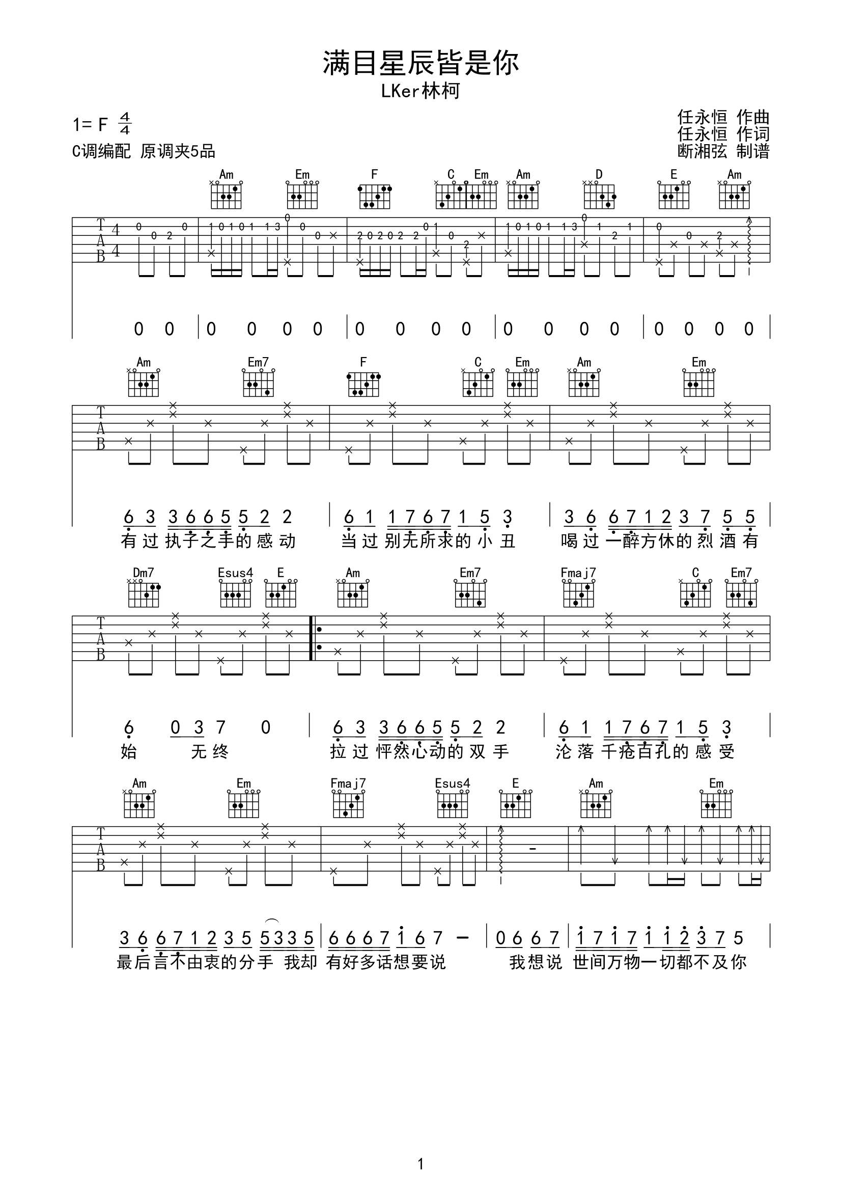 曲谱介绍: 《满目星辰皆是你》总共3张高清图片谱,原调是F调,本谱为C调,建议夹5品弹唱这首歌曲。
