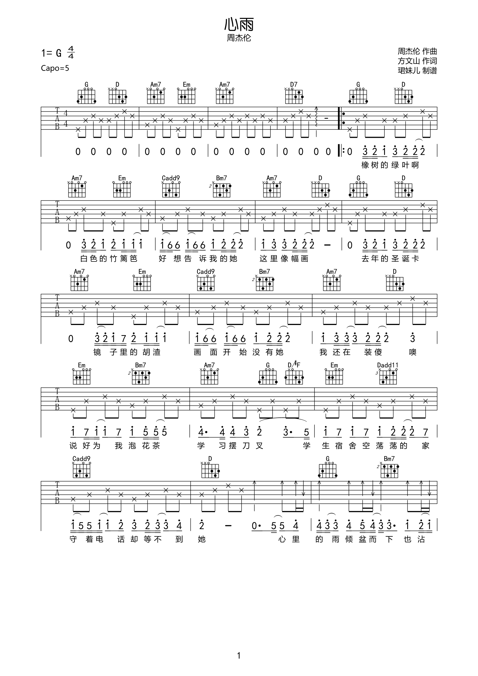 曲谱介绍: 《心雨》这首曲谱总共2张高清图片谱,本谱采用G调指法编配,弹唱建议变调夹5品,难度较简单。