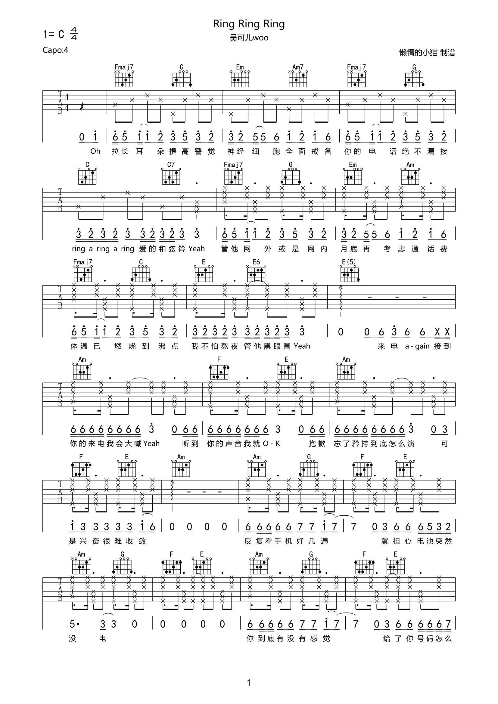 曲谱介绍: 《Ring Ring Ring》总共3张高清图片谱,原调为E调,使用C调指法,变调夹夹四品弹唱。