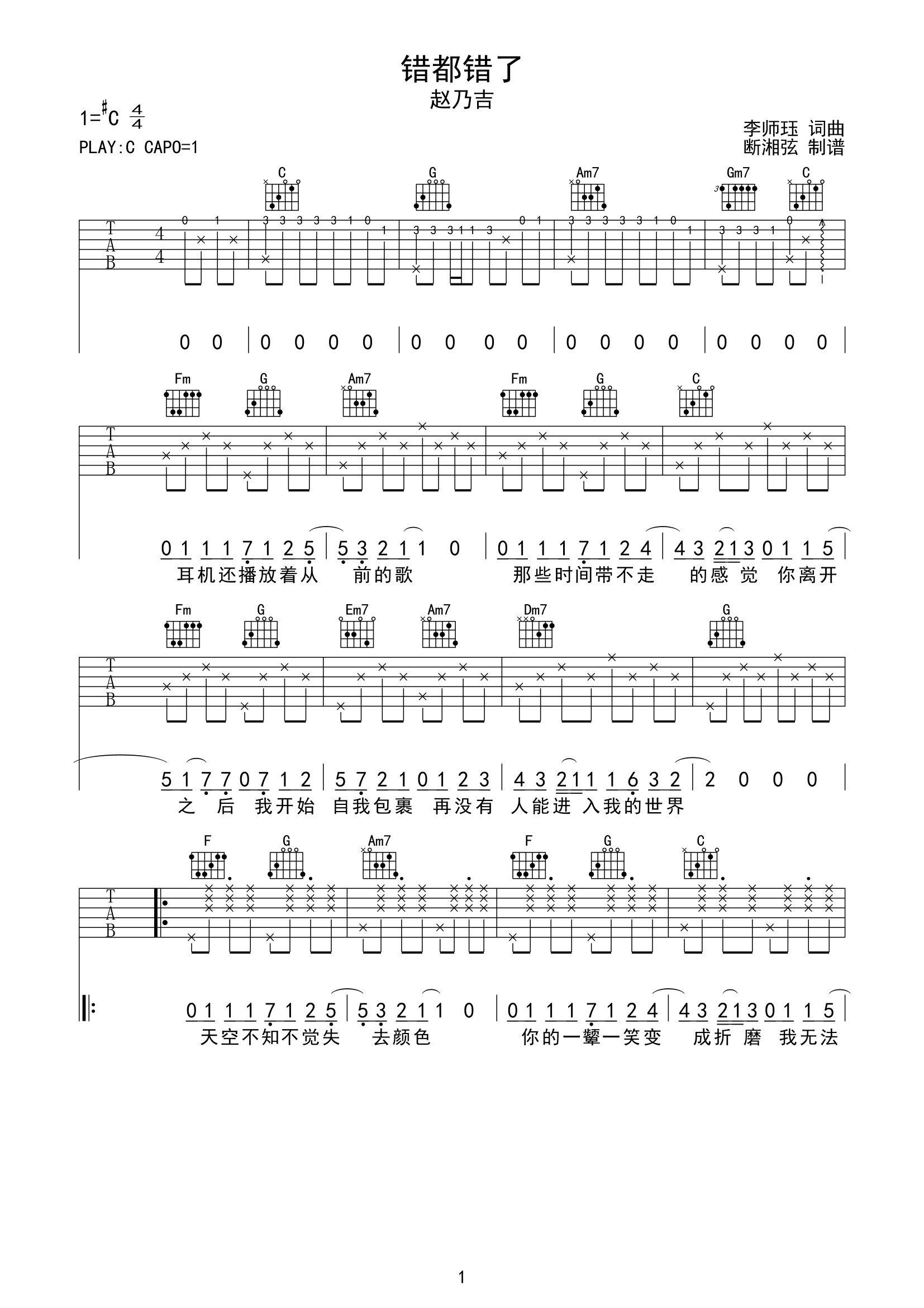 曲谱介绍: 《错都错了》总共3张高清图片谱,本谱为C调编配,变调夹夹1品弹唱原调#C,包含前奏,弹唱难度较简单。