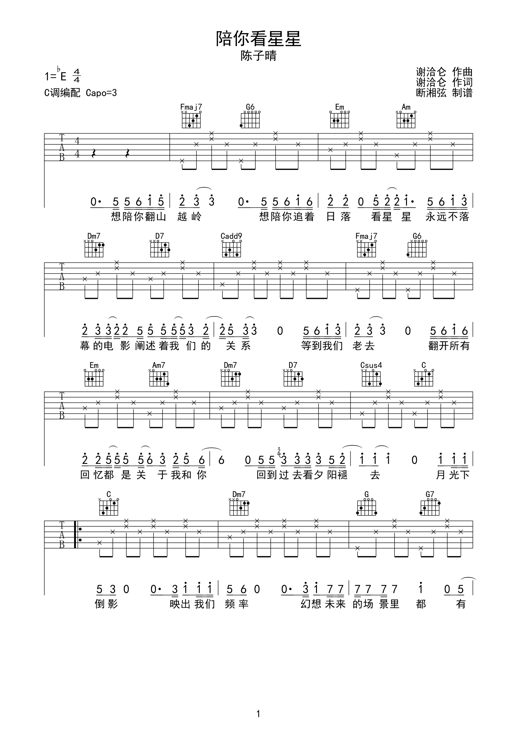 曲谱介绍: 《陪你看星星》总共3张高清图片谱,原调bE,本谱为C调指法编配,变调夹夹3品弹唱原调。