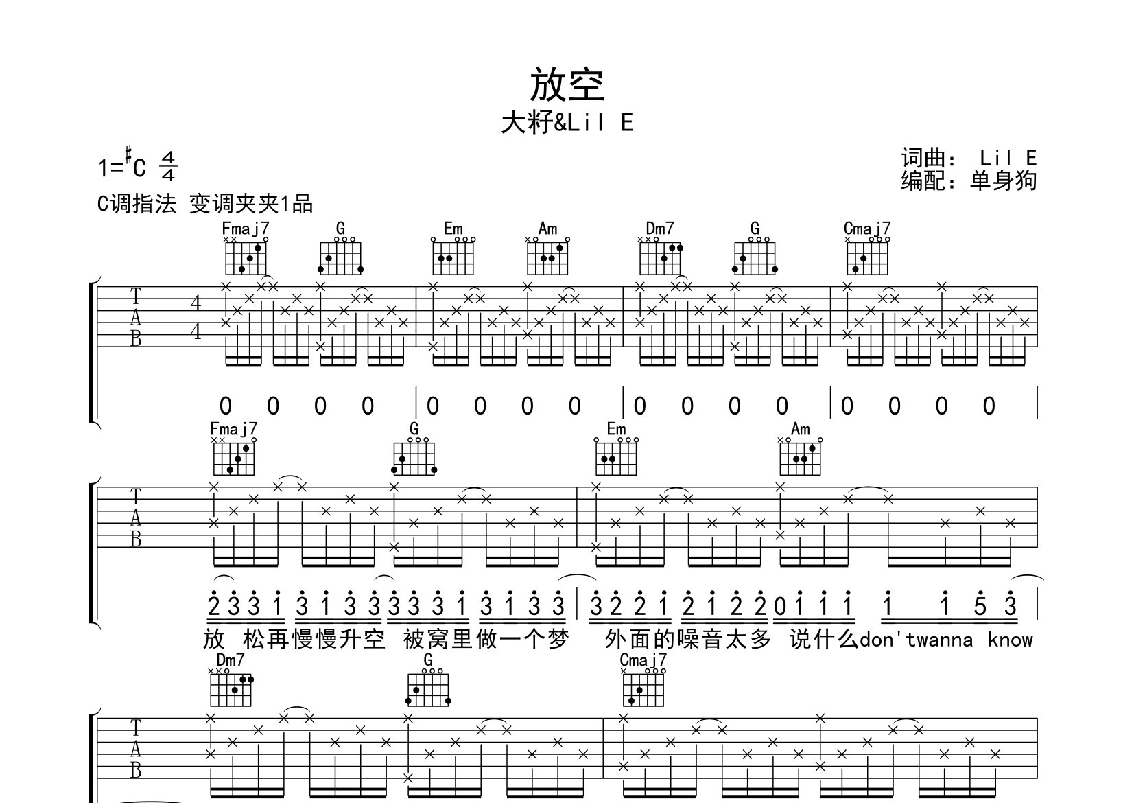 曲谱介绍: 《放空》总共4张高清图片谱,原调为#C调,使用C调指法编配,推荐变调夹夹1品弹唱。