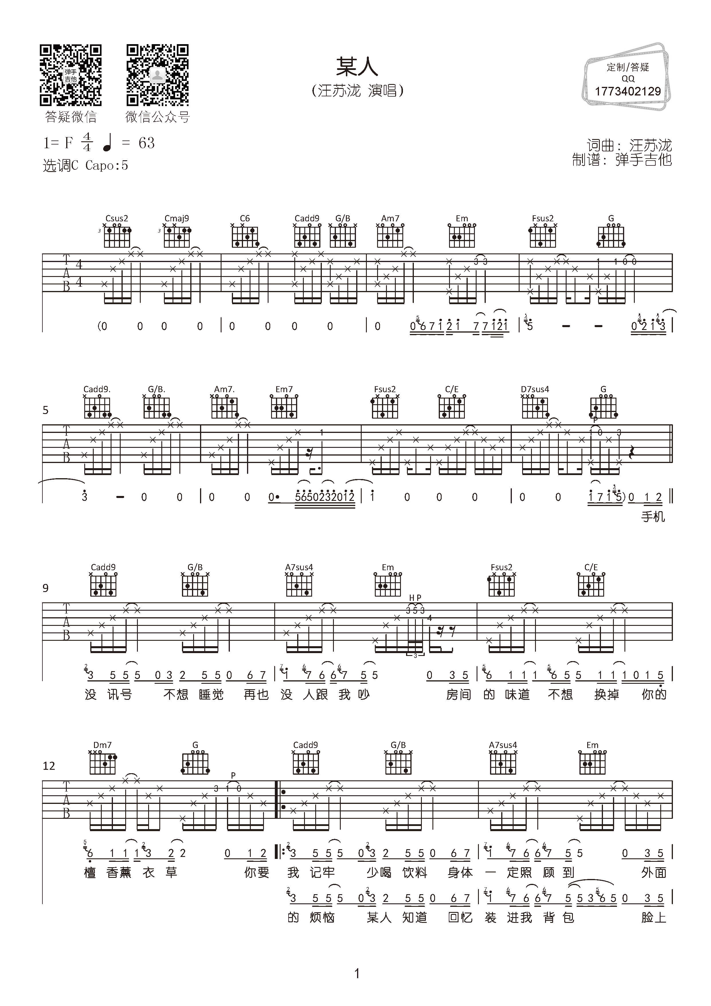 曲谱介绍: 《某人》总共3张高清图片谱,原调F调,选用C调指法,变调夹夹5品弹唱原调。