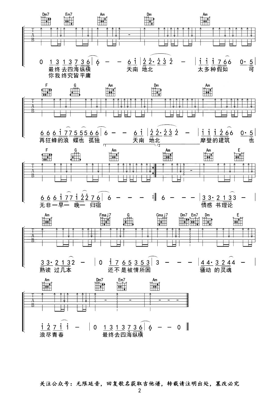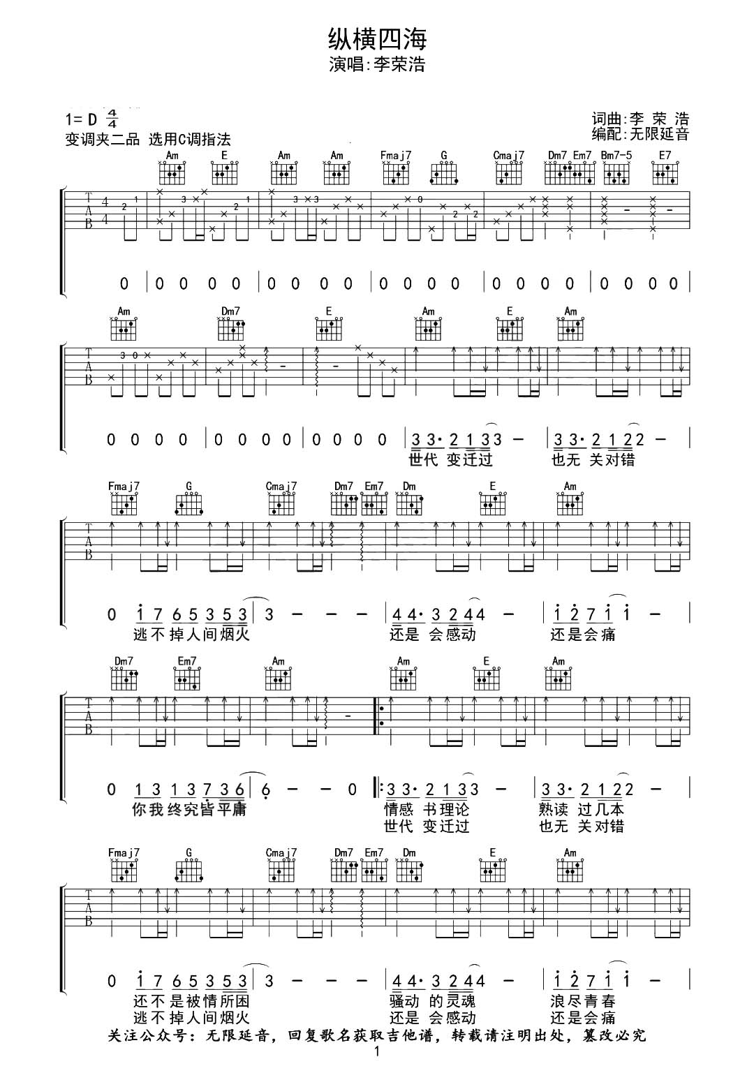 曲谱介绍: 《纵横四海》总共2张高清图片谱,由无限延音制谱,原调D调,选用C调指法,变调夹推荐夹2品弹唱这首曲谱。