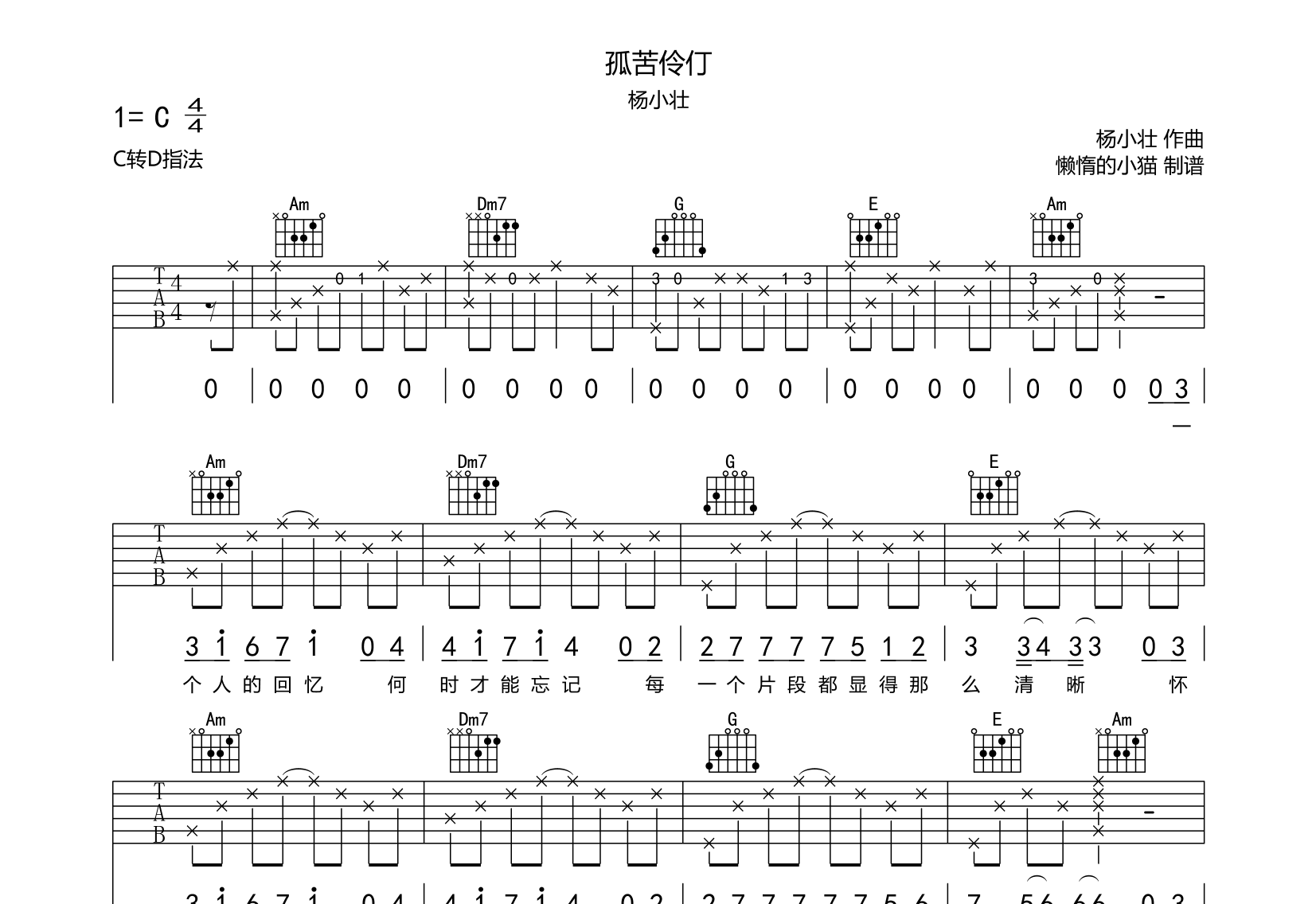 孤苦伶仃吉他谱 - 杨小壮 - C调吉他弹唱谱