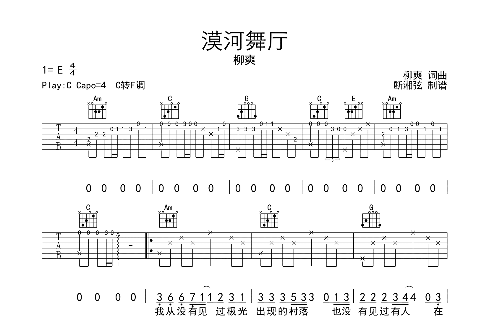 曲谱介绍: 《漠河餐厅》原调是E调,本谱为C转F调指法编配,建议变调夹夹4品弹唱。