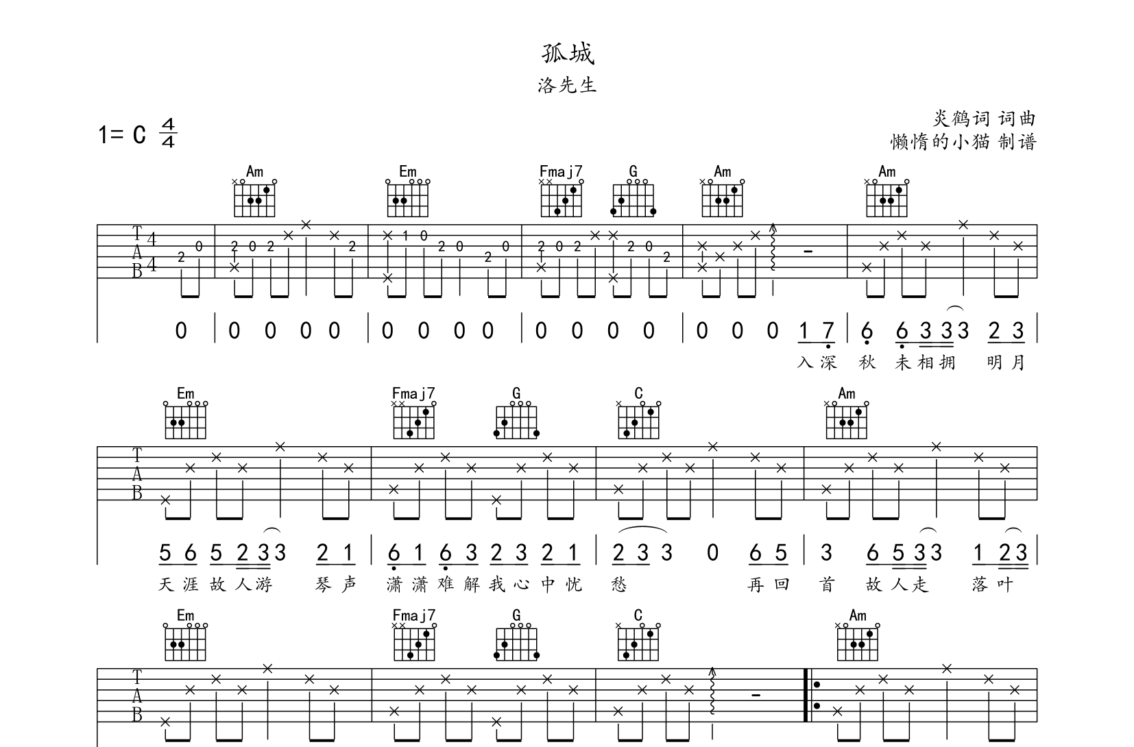 孤城吉他谱 - 洛先生 - C调吉他弹唱谱