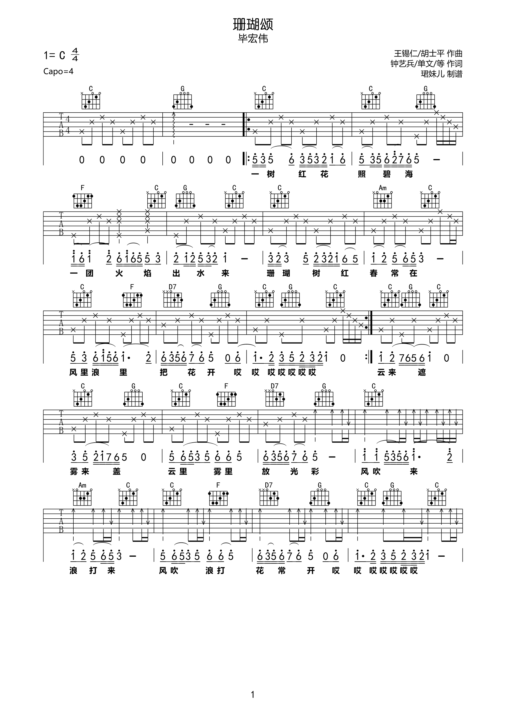 曲谱介绍: 《珊瑚颂》总共2张高清图片谱,本谱采用C转F调指法编配,弹唱建议变调夹4品,难度较简单。