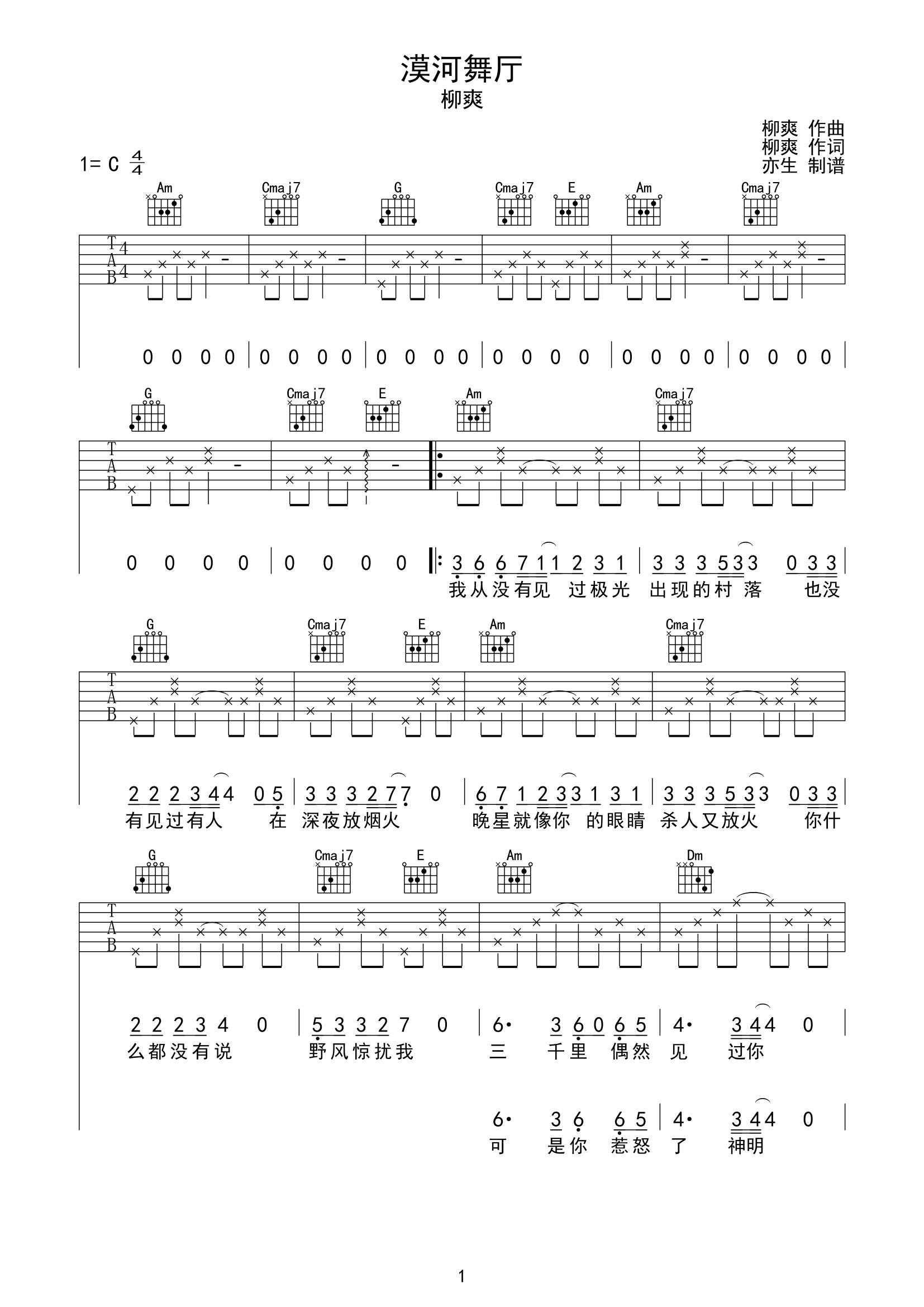 曲谱介绍: 《漠河舞厅》总共3张高清图片谱,采用C调指法编配,难度比较简单,建议变调夹夹4品弹唱这首曲谱。