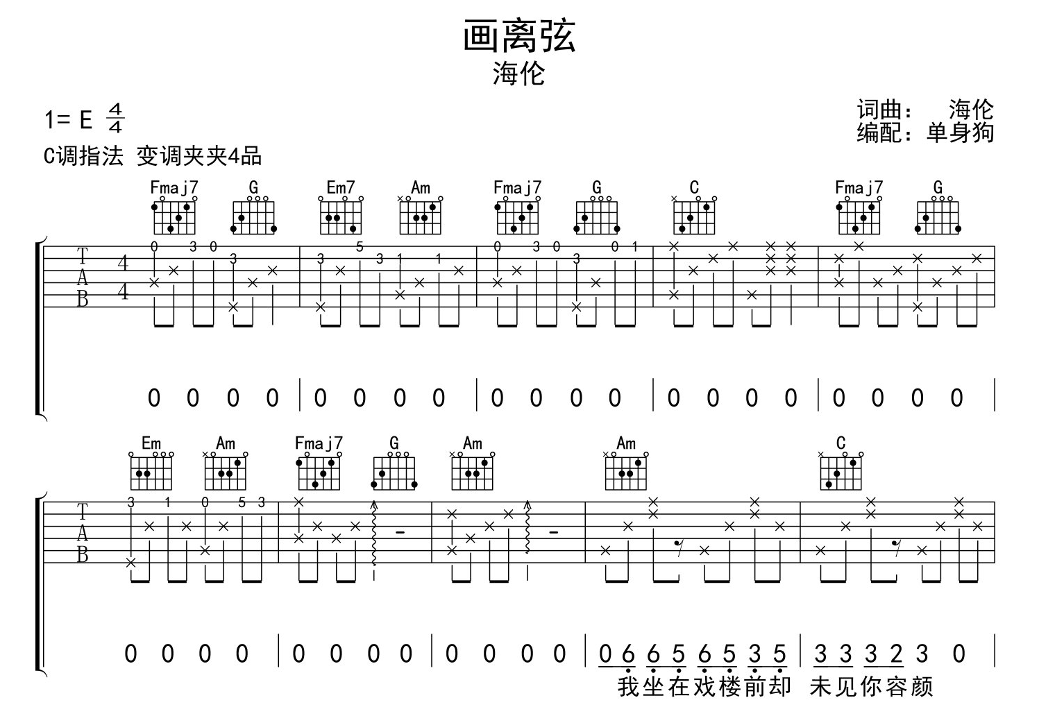 曲谱介绍: 《画离弦》总共3张高清图片谱,原调是E调,选用C调指法编配,变调夹推荐夹4品弹唱原调,包含前奏,弹唱难度适中。
