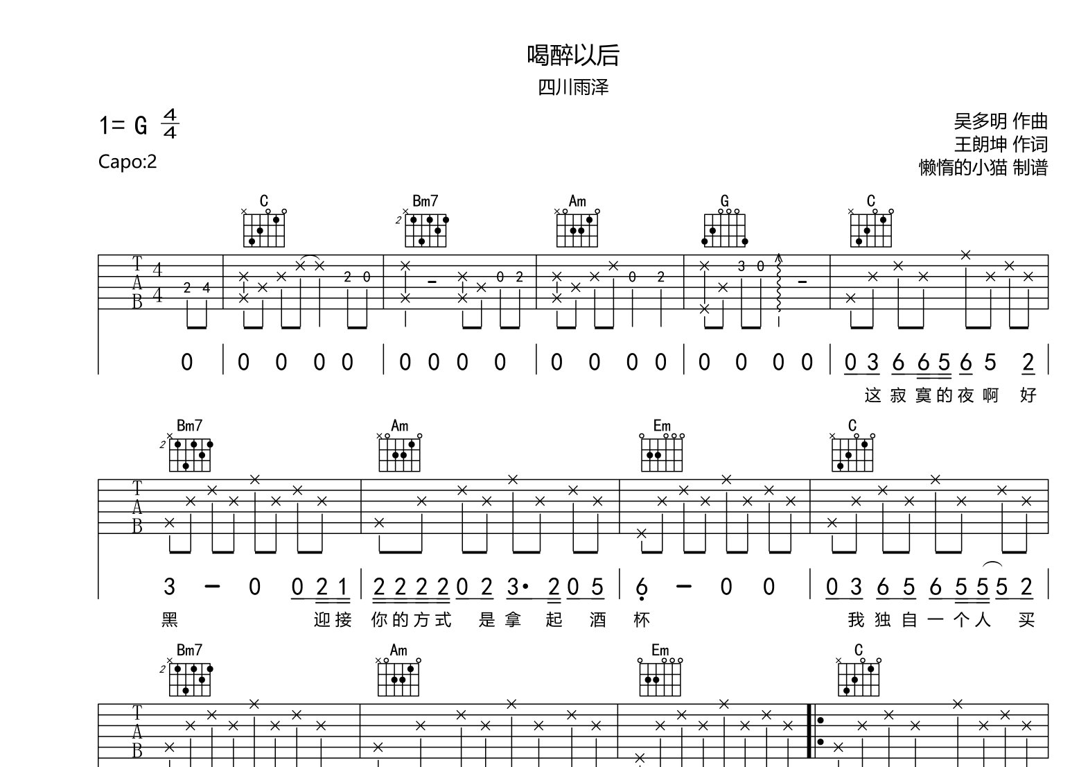 喝醉以后吉他谱 - 四川雨泽 - G调吉他弹唱谱 - 原版