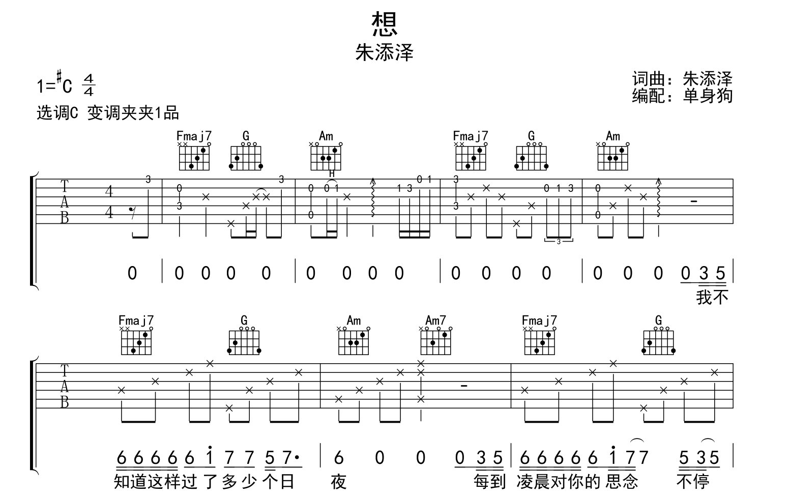 想吉他谱 - 朱添泽 - C调吉他弹唱谱