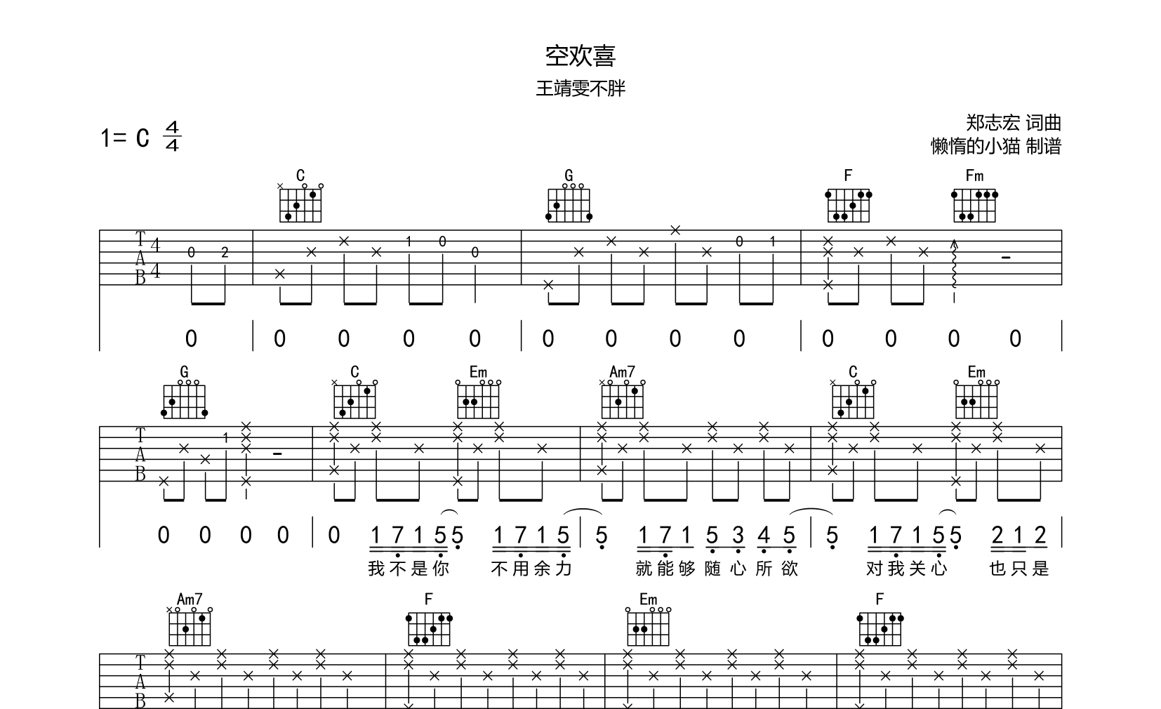 空欢喜吉他谱 - 王靖雯 - C调吉他弹唱谱 - 原版