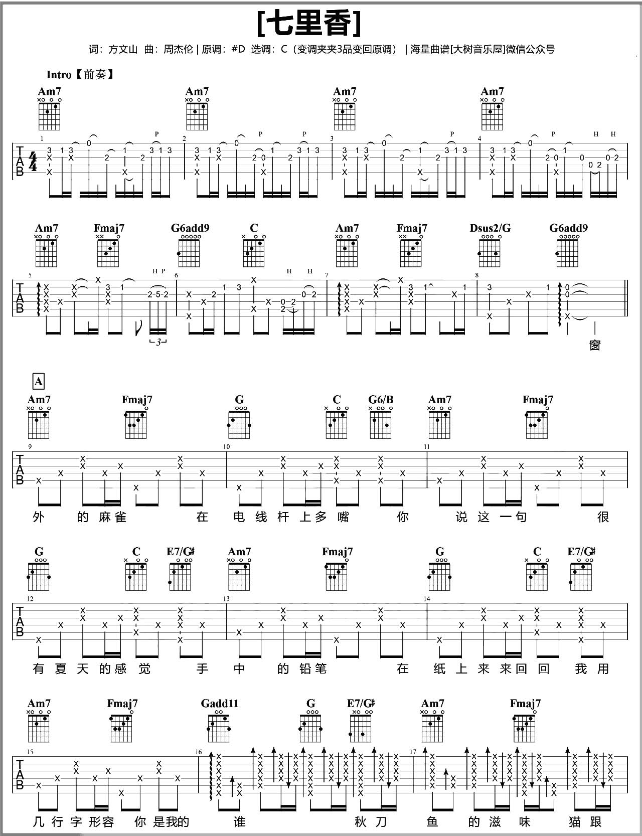 曲谱介绍: 《七里香》吉他弹唱教学视频