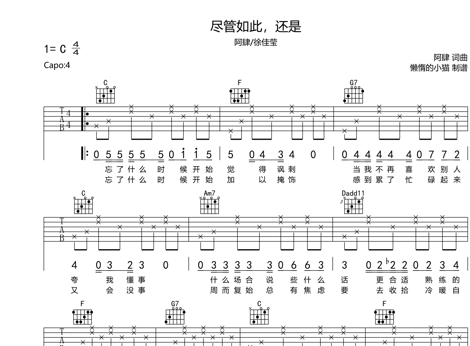 尽管如此,还是吉他谱 - 阿肆/徐佳莹 - C调吉他弹唱谱
