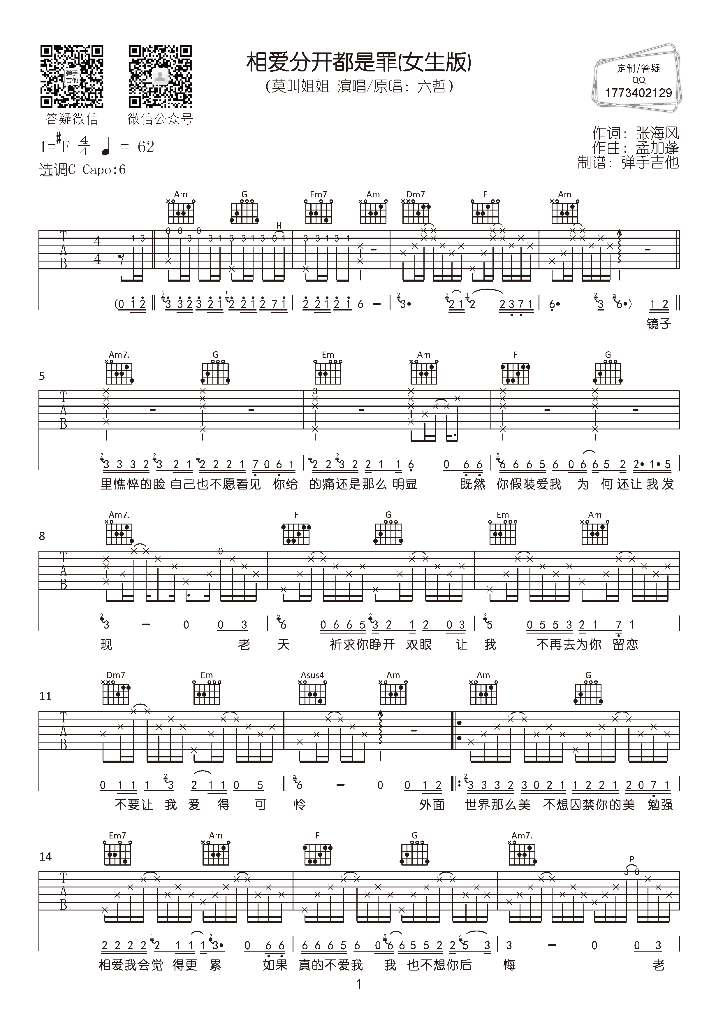 曲谱介绍: 《相爱分开都是罪》总共3张高清图片谱,原调#F,选用C调指法,变调夹夹6品弹唱女声原调,速度每分钟62拍,前奏完整,弹唱难度较为简单。