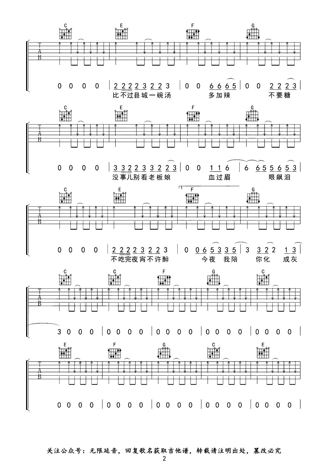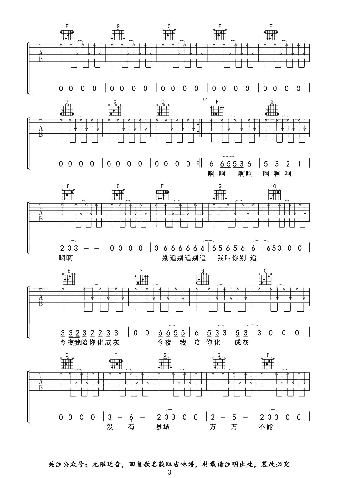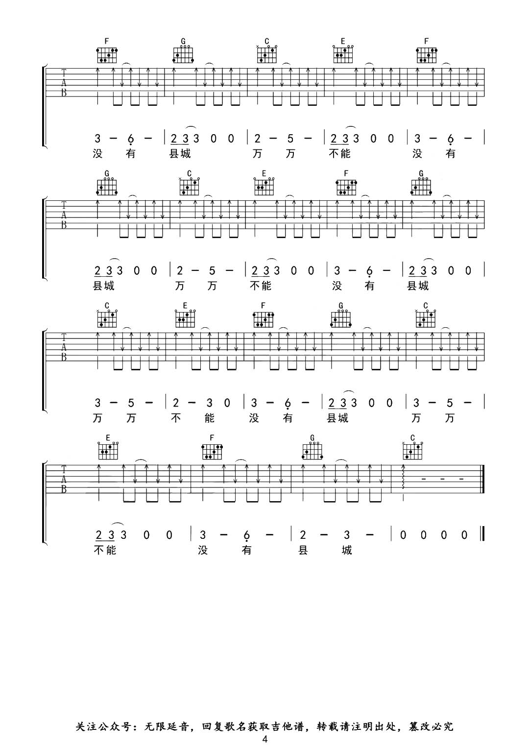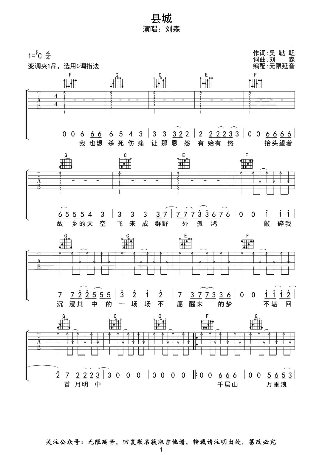 曲谱介绍: 《县城》由无限延音制谱,总共4张高清图片谱,原调#C,选用C调指法,变调夹夹1品弹唱原调。