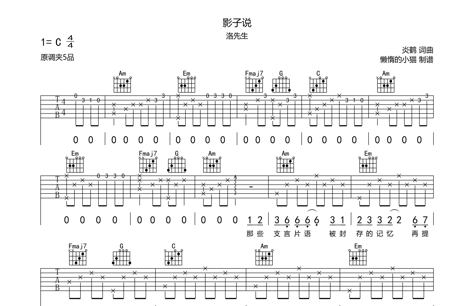 影子说吉他谱 - 洛先生 - C调吉他弹唱谱