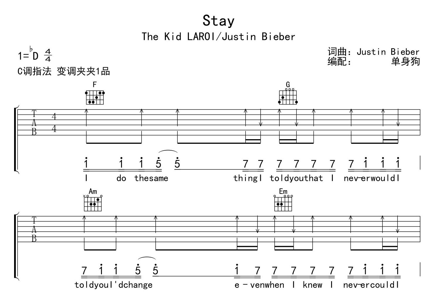 曲谱介绍: Stay吉他谱_The Kid LAROI/Justin Bieber_C调弹唱六线谱,由单身狗制谱上传至玩吉他。《stay》这首歌曲是Justin Bieber作词作曲并和The Kid LARO共同演唱的一首英文歌曲。轻快的电音编曲,符合现代的年轻的文化时尚,反复循环之中不知不觉就会结束,让你觉得这首歌曲太短了。《Stay》总共4张高清图片谱,原调是bD,选用C调指法编配,整体的弹唱难度较为简单,感兴趣的朋友不妨试弹一下吧。