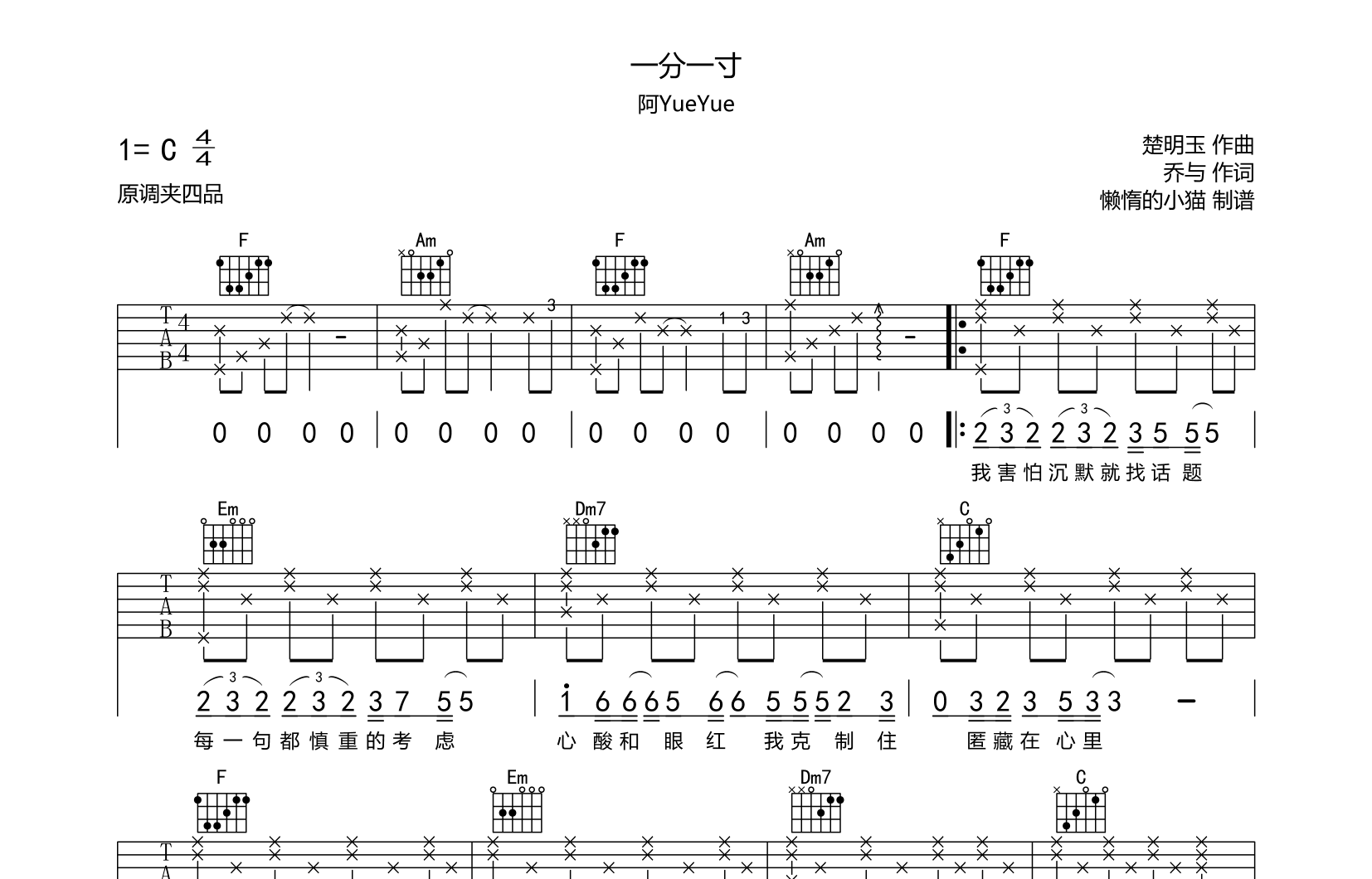 一分一寸吉他谱 - 阿yueyue - C调吉他弹唱谱 - 原版