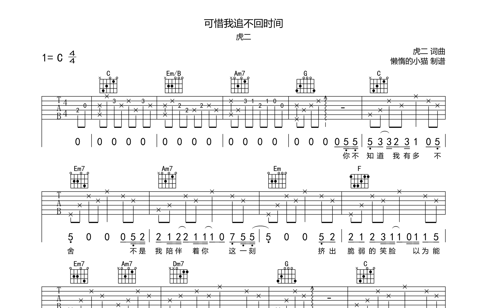 可惜我追不回时间吉他谱 - 虎二 - C调吉他弹唱谱 - 原版