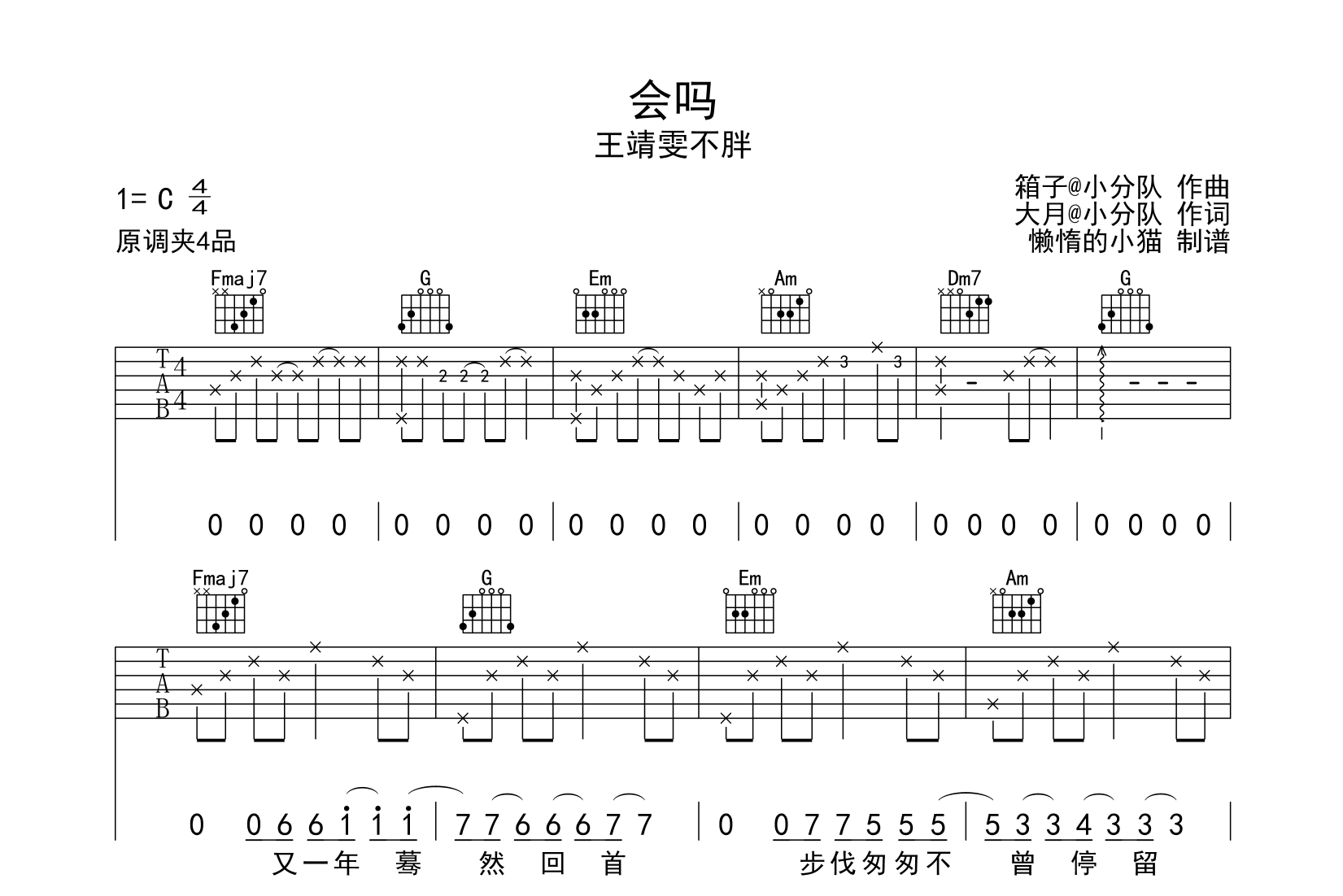 曲谱介绍: 《会吗》总共由3张高清图片谱,原调E调,使用C调指法,推荐变调夹夹4品弹唱这首曲谱。