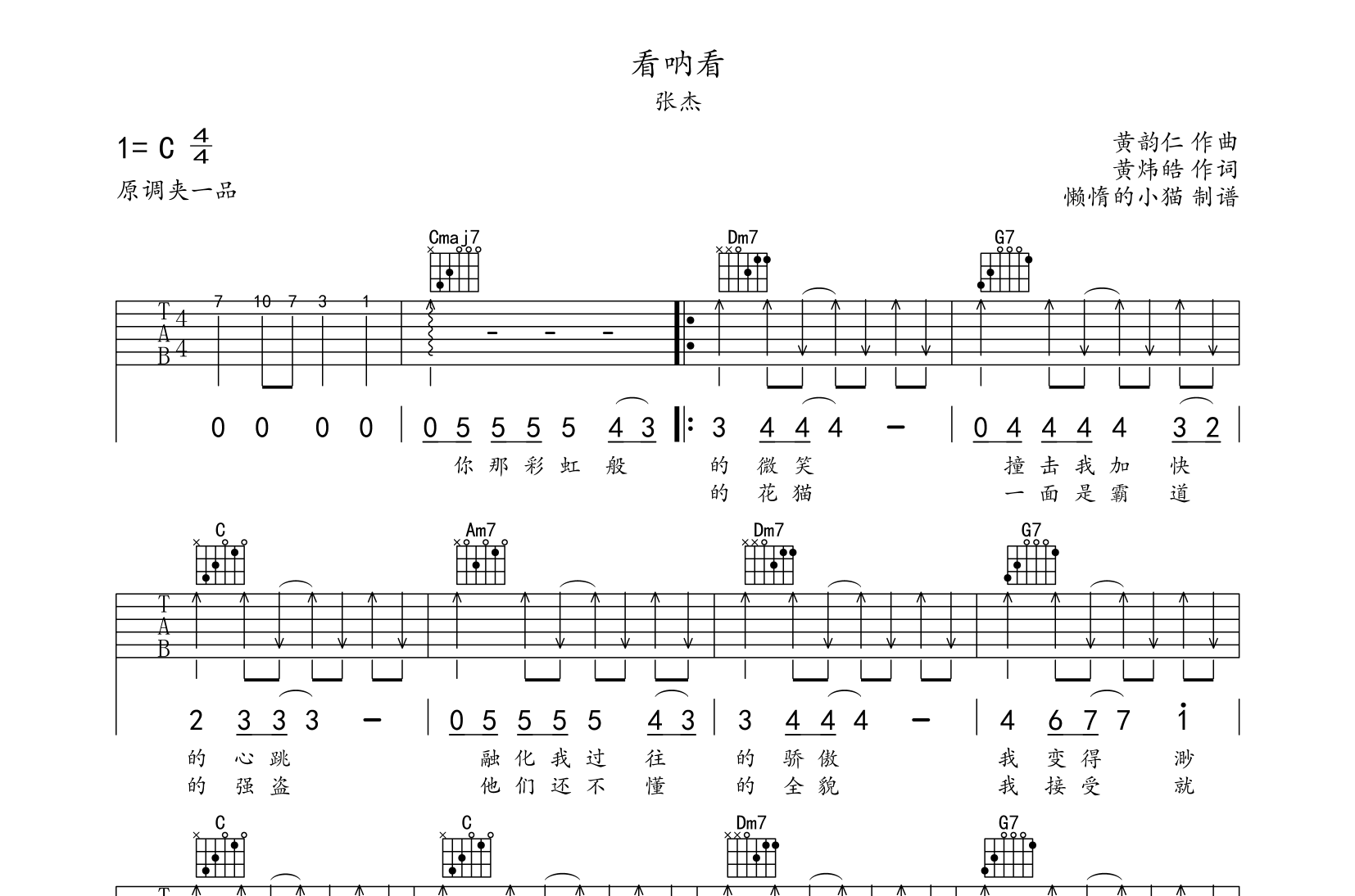 曲谱介绍: 《看呐看》总共2张高清图片谱,原调为升C调,使用C调指法编配,变调夹可以夹1品弹唱原调,本谱以扫弦节奏为主,注意扫弦延音的节拍技巧,整体弹唱难度较为简单。
