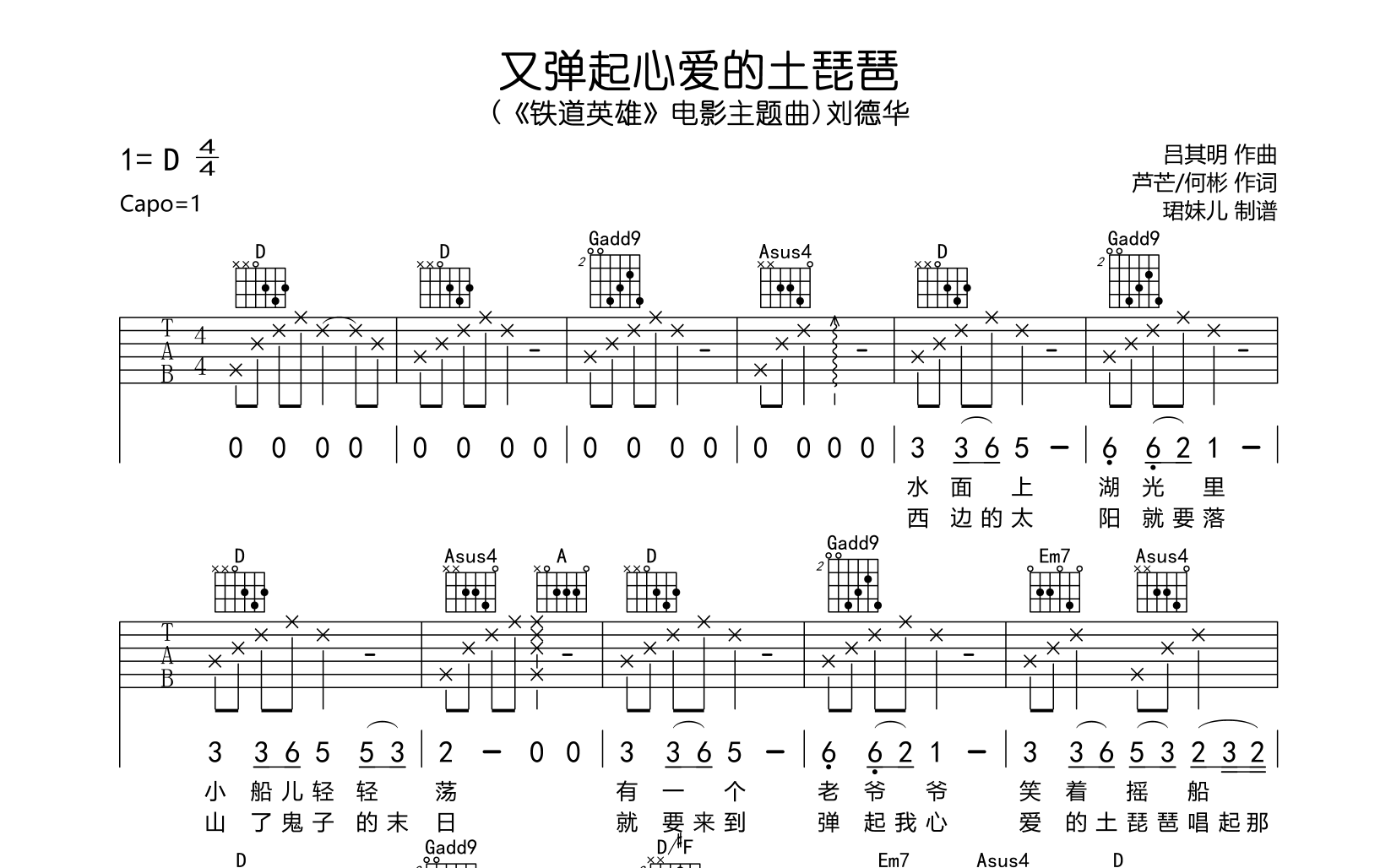 曲谱介绍: 《又弹起心爱的土琵琶》这首曲谱总共2张高清土琵琶,本谱采用D转E调指法编配,弹唱建议变调夹1品,难度较简单。