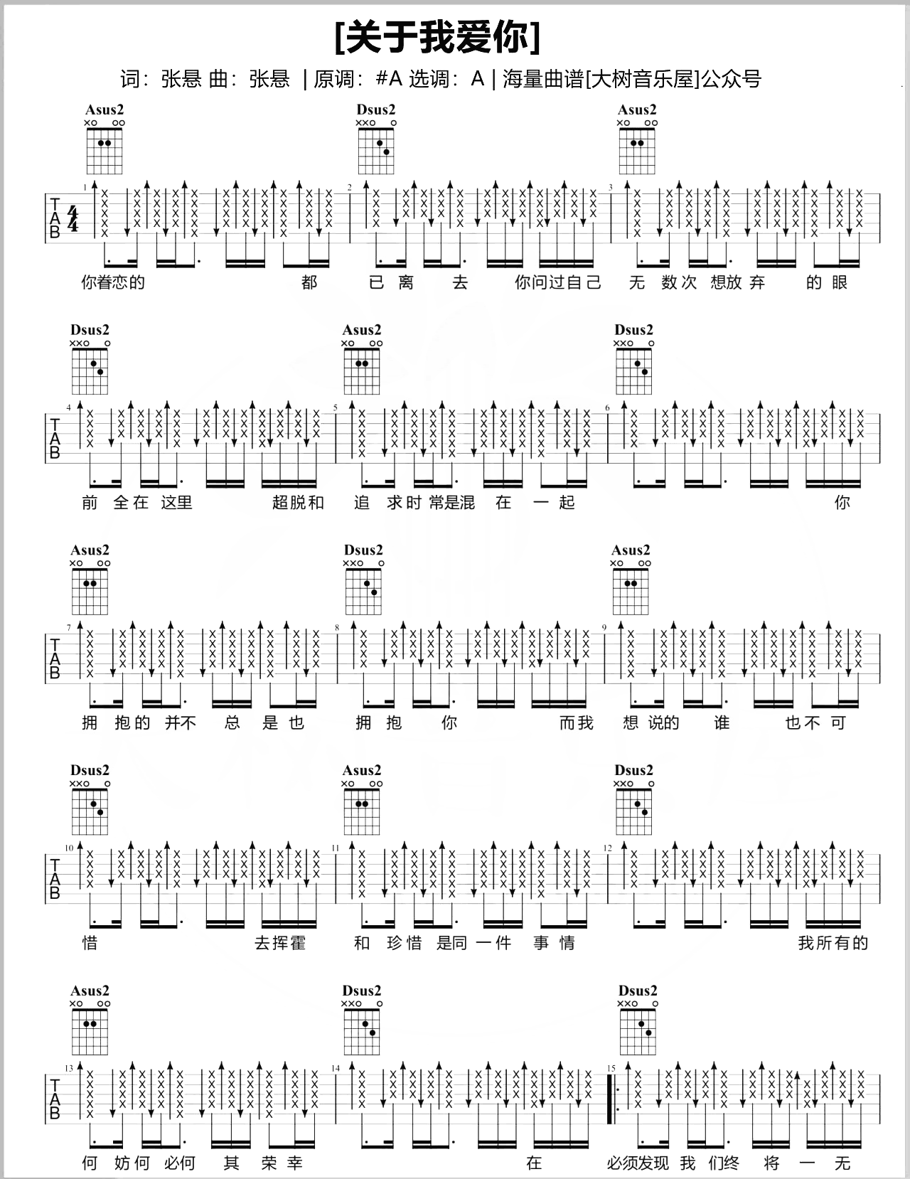 关于我爱你吉他谱 - 张悬 - A调吉他弹唱谱