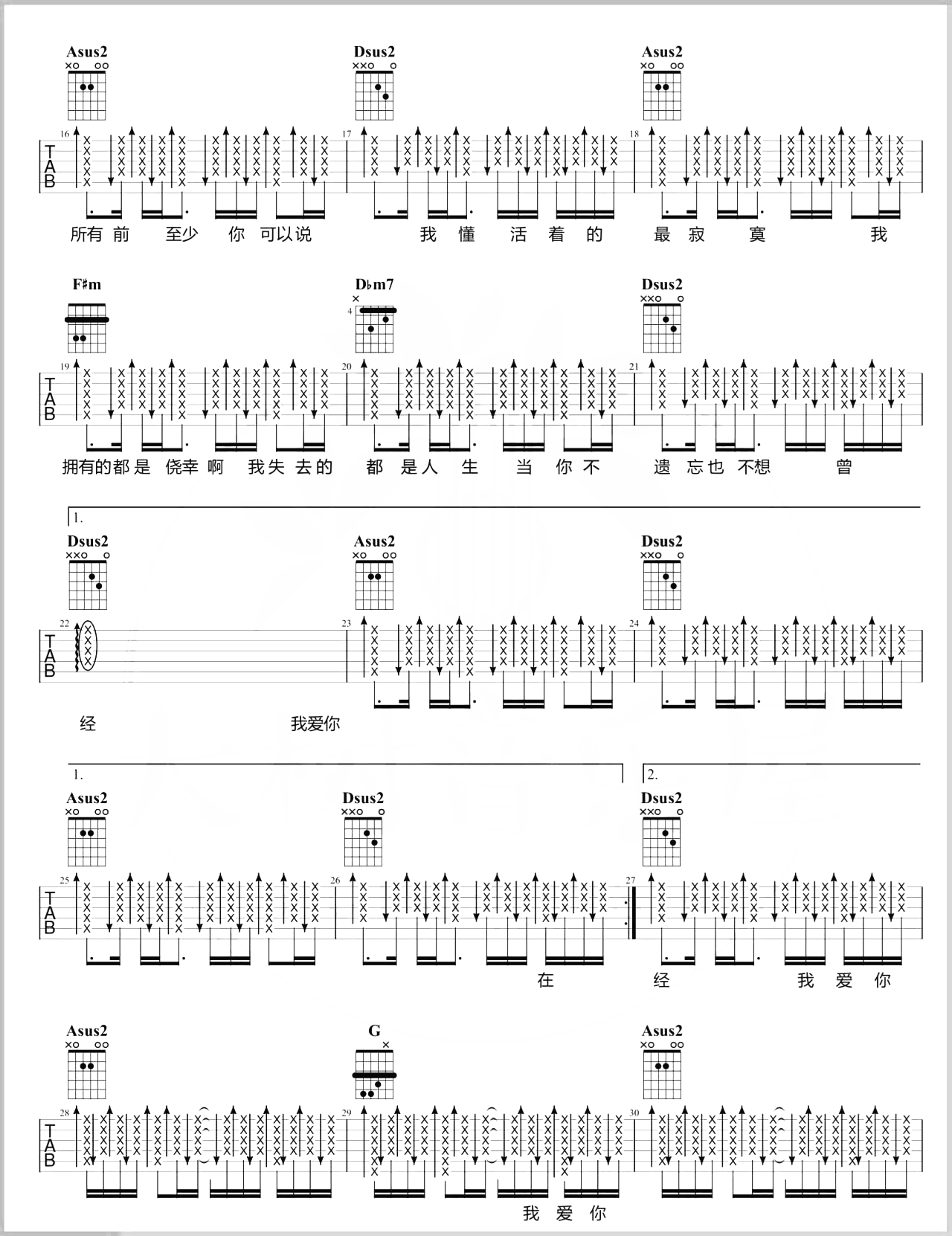 曲谱介绍: 关于我爱你吉他谱_张悬/沈以诚_A调扫弦版六线谱_吉他弹唱教学。《关于我爱你》是张悬原创并演唱的一首歌曲,有些歌让人过渡,有些歌让人成长,而这首歌曲将道别的味道娓娓道来,一切美好都已不重要,在最重要的时光里,至少有过你,关于我爱你的,都已成为往事。 《关于我爱你》吉他弹唱教学视频