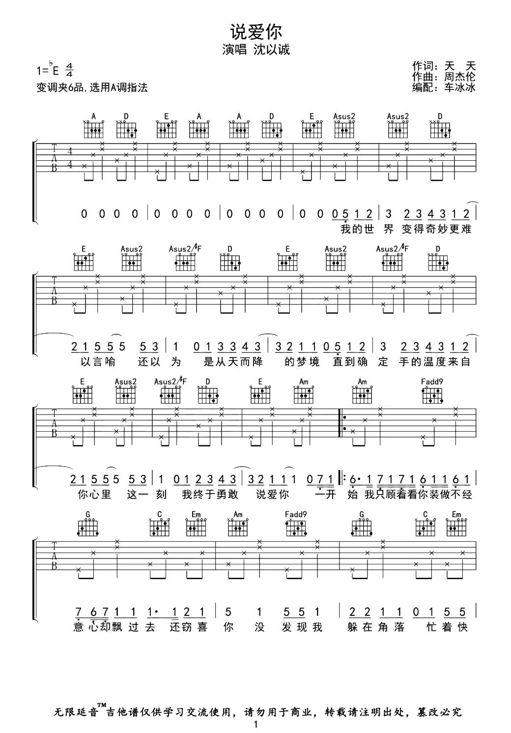 曲谱介绍: 说爱你吉他谱_沈以诚版_《说爱你》A调指法弹唱六线谱,上传至玩吉他。《说爱你》是天天作词,周杰伦作曲,蔡依林原唱的歌曲,沈以诚翻唱的男声版。清澈的吉他和质感的嗓音让这首歌曲有着独特的试听感受。手心的温度,耳边的喃喃细语,直到鼓起勇气表白了一句“我爱你”,那种情窦初开的感觉,是这首歌曲传递出的甜蜜幸福味道,说爱你从那一天起,希望能够一直将美好的样子延续下去。