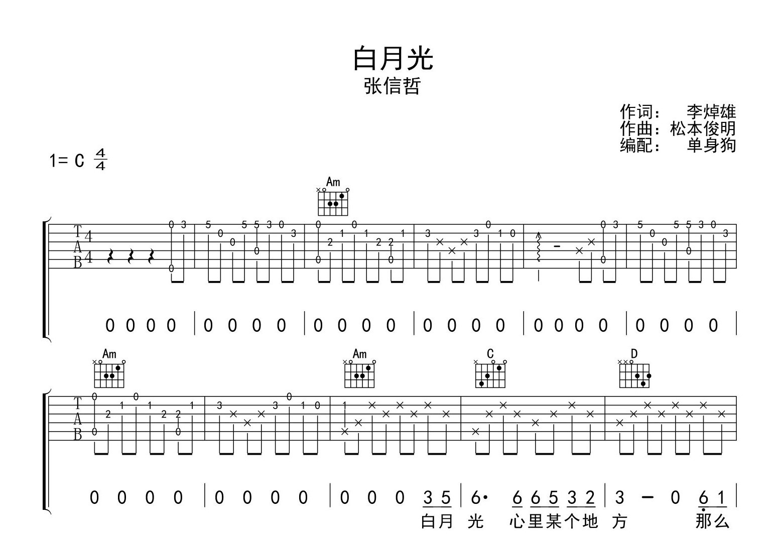 白月光吉他谱 - 张信哲 - C调吉他弹唱谱 - 原版