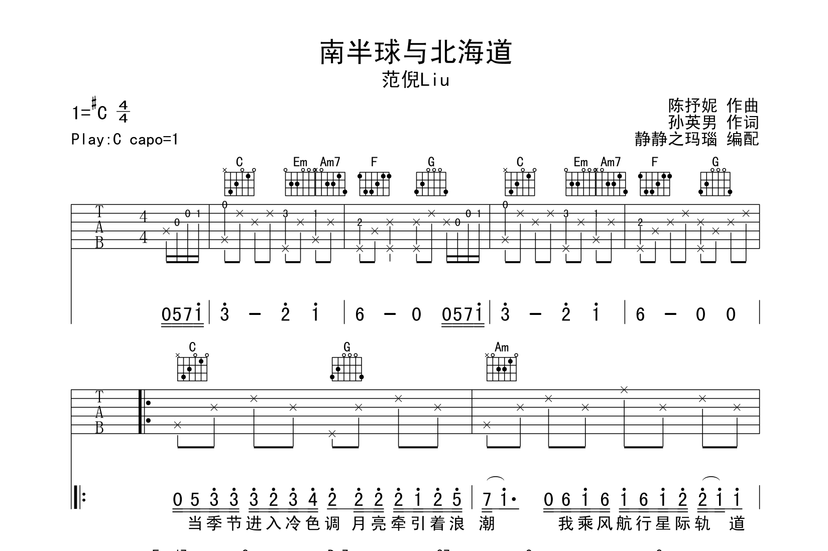 曲谱介绍: 《南半球与北海道》吉他谱,总共3张高清图片谱,由创作者静静之玛瑙制谱,原调是#C,选用C调指法编配,推荐变调夹夹1品弹唱,包含完整的前奏,弹唱较简单。