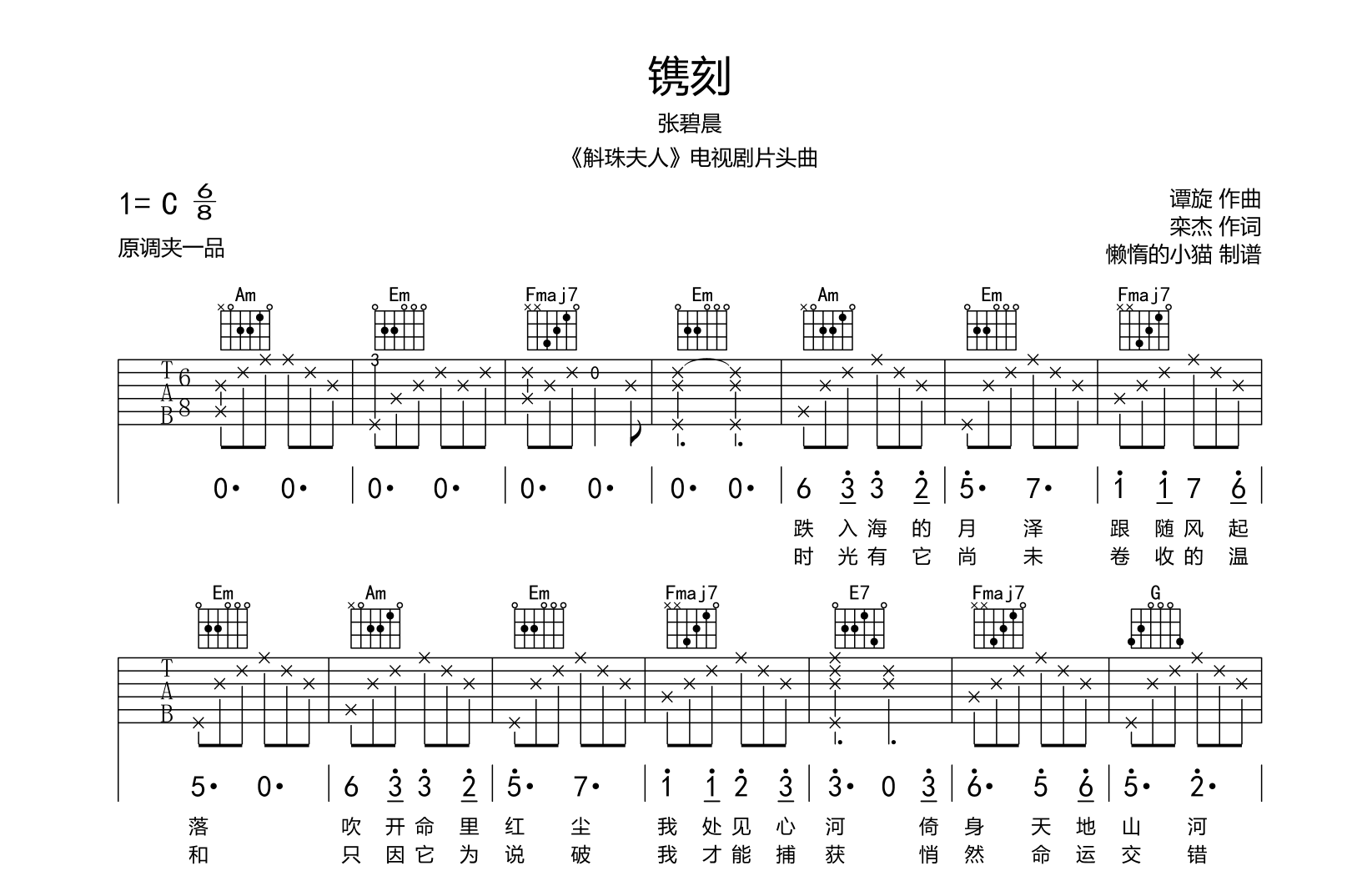 曲谱介绍: 镌刻吉他谱,总共3张高清图片谱例,原调为#C调,使用C调指法编配,变调夹建议夹1品弹唱这首歌曲,包含了简单的前奏,弹唱难度不算太大,本谱创作者@懒惰的小猫编配制谱,喜欢《镌刻》这首歌曲的朋友,赶紧试弹一下吧。