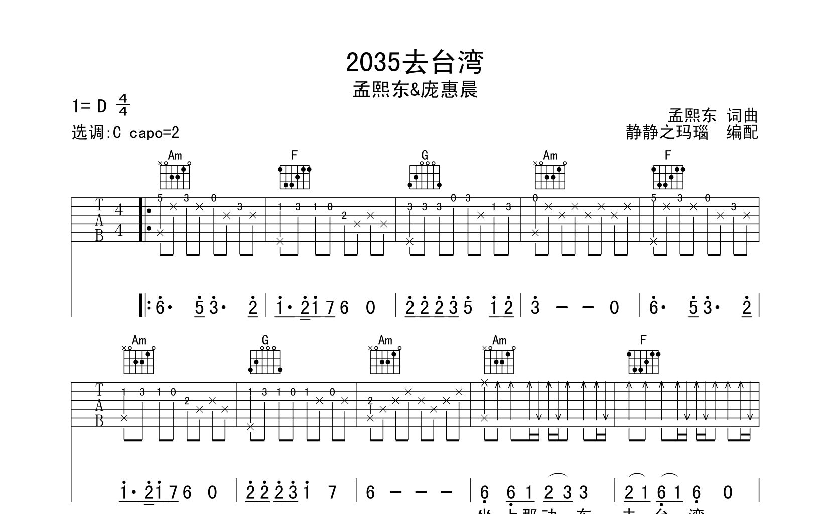 2035去台湾吉他谱 - 孟煦东/庞惠晨 - C调吉他弹唱谱 - 原版