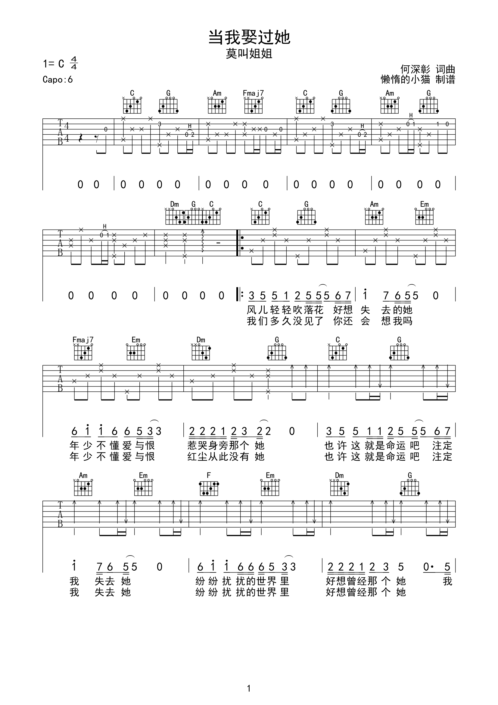 曲谱介绍: 当我娶过她吉他谱,总共3张高清图片谱,原调为升F调,使用C调指法,标准调音,建议变调夹夹6品弹唱,曲谱包含前奏和尾奏,版本还原度较高,喜欢这首谱子的朋友不妨试弹一下,创作者懒惰的小猫编配制谱上传。